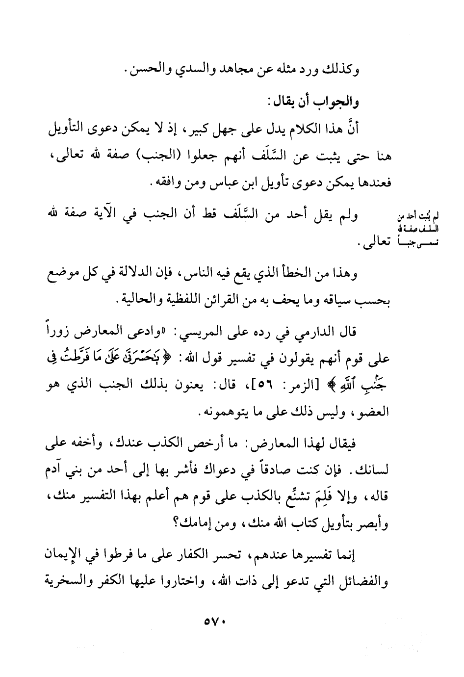 قال الدارمي في رده على المريسي: (وادعى المعارض زوراً على قوم أنهم يقولون في تفسير قول الله: {يا حسرتى على ما فرطت في جنب الله} الزمر56، قال: يعنون بذلك الجنب الذي هو العضو، وليس ذلك على ما يتوهمونه.