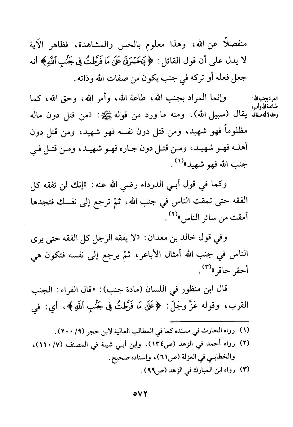 وإنما المراد بجنب الله، طاعة الله، وأمر الله، وحق الله، كما يقال (سبيل الله). ومنه ما ورد من قوله - صلى الله عليه وسلم -: (من قتل دون ماله مظلوما فهو شهيد، ومن قتل دون نفسه فهو شهيد، ومن قتل دون أهله فهو شهيد، ومن قتل دون جاره فهو شهيد، ومن قتل في جنب الله فهو شهيد) (¬1).