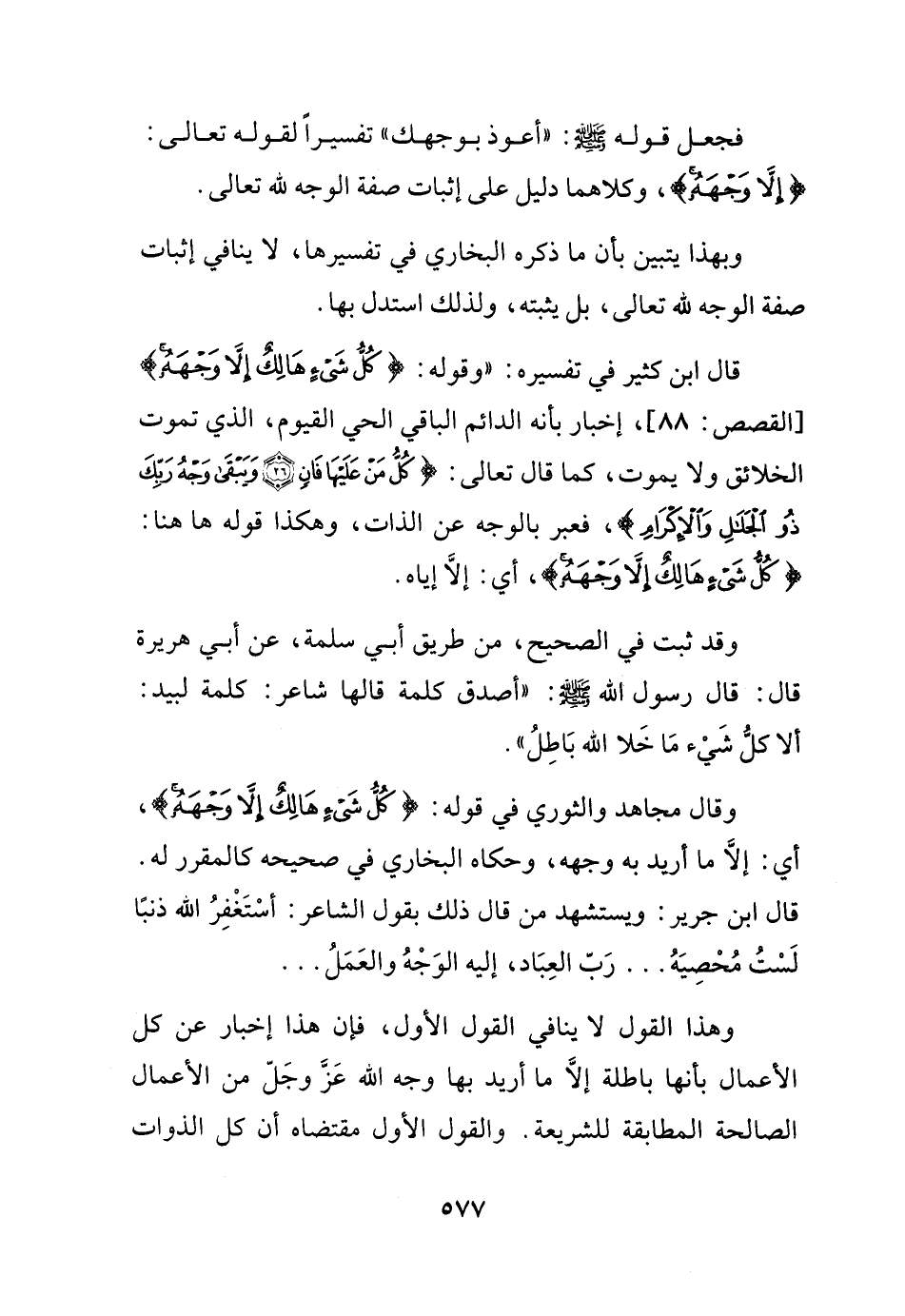 فجعل قوله - صلى الله عليه وسلم -: (أعوذ بوجهك) تفسيراً لقوله تعالى: {إلا وجهه}، وكلاهما دليل على إثبات صفة الوجه لله تعالى.