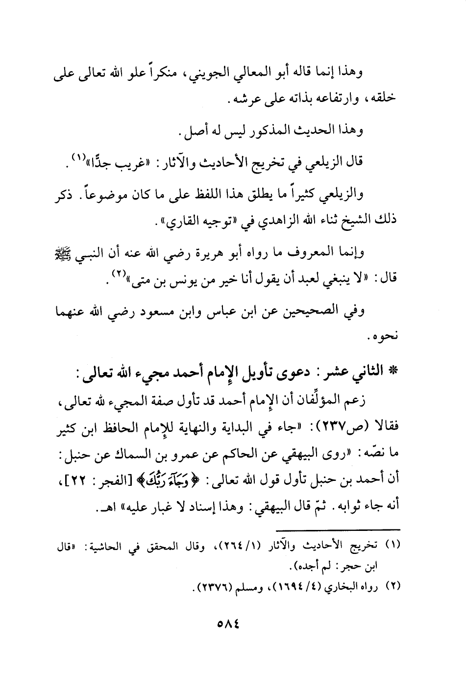 زعم الأشعريان أن الإمام أحمد قد تأول صفة المجيء لله تعالى فقالا: (جاء في البداية والنهاية للإمام الحافظ ابن كثير ما نصه: "روى البيهقي عن الحاكم عن عمرو بن السماك عن حنبل: أن أحمد بن حنبل تأول قول الله تعالى: {وجاء ربك} الفجر22، أنه جاء ثوابه. ثم قال البيهقي: وهذا إسناد لا غبار عليه) اهـ.