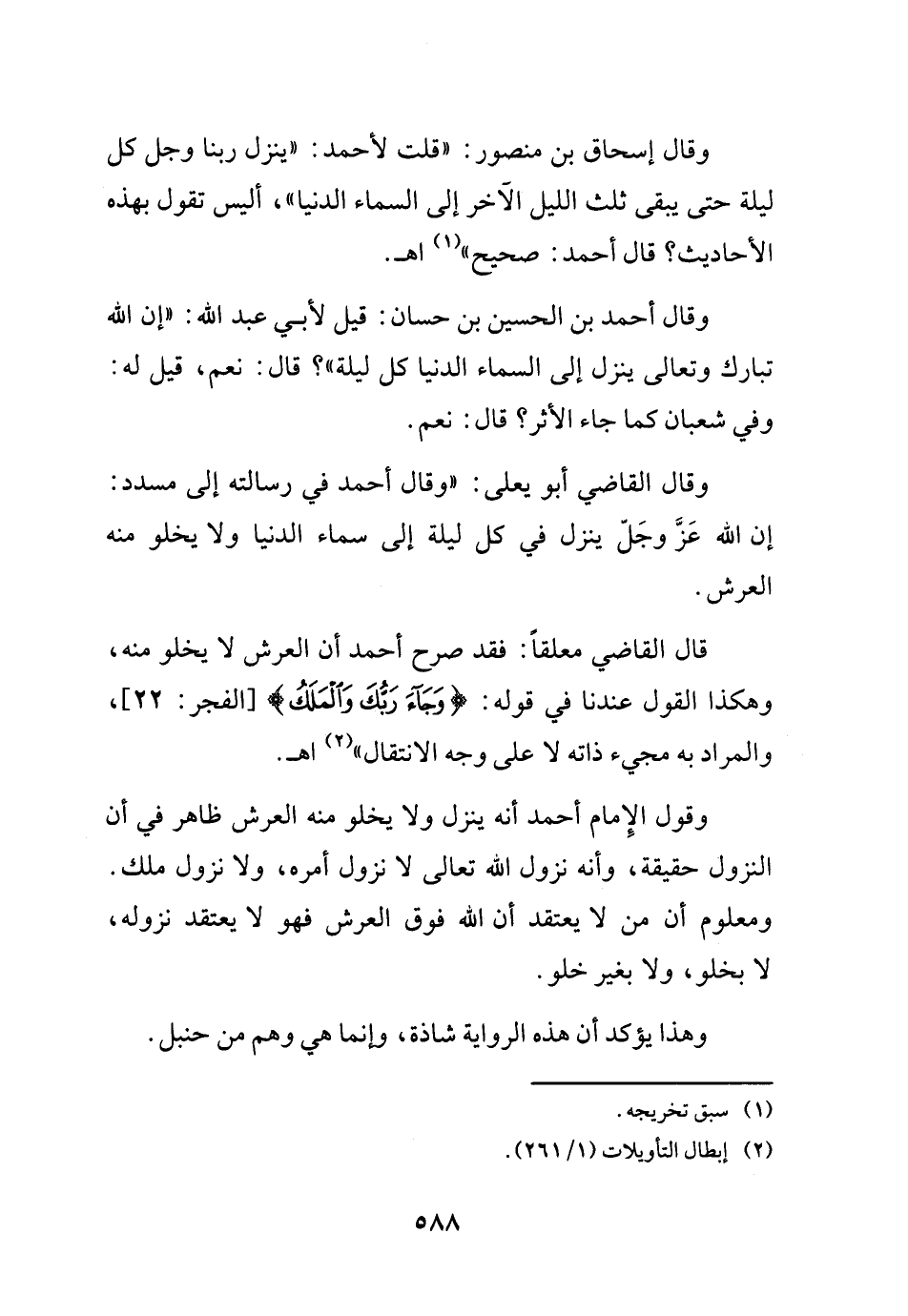 وقال القاضي أبو يعلى: (وقال أحمد في رسالته إلى مسدد: إن الله عز وجل ينزل في كل ليلة إلى سماء الدنيا ولا يخلو منه العرش.