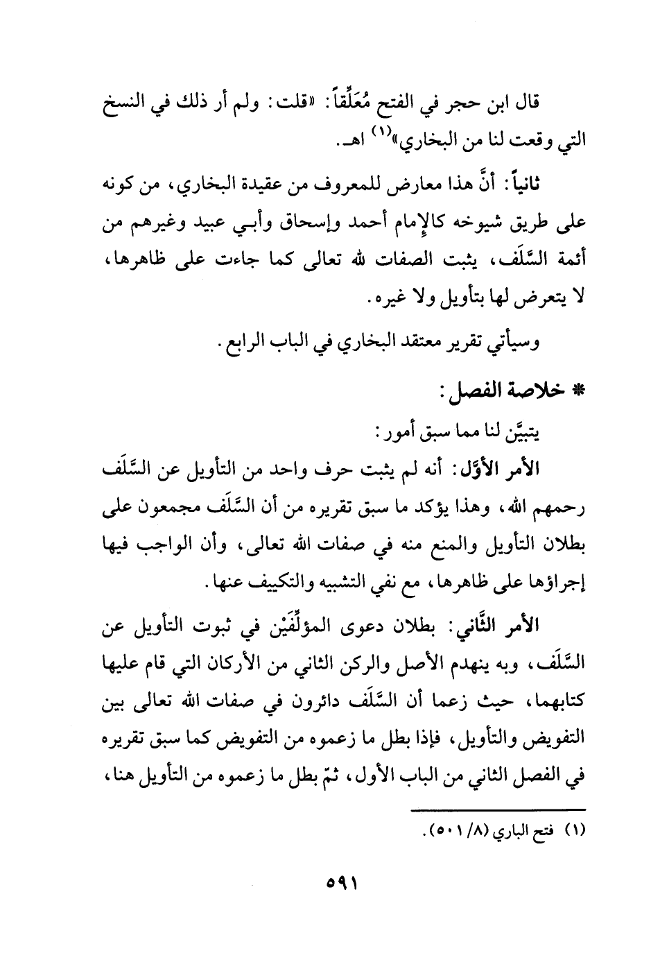 ثانياً: أن هذا معارض للمعروف من عقيدة البخاري، من كونه على طريق شيوخه كالإمام أحمد وإسحاق وأبي عبيد وغيرهم من أئمة السلف، يثبت الصفات لله تعالى كما جاءت على ظاهرها، لا يتعرض لها بتأويل ولا غيره.