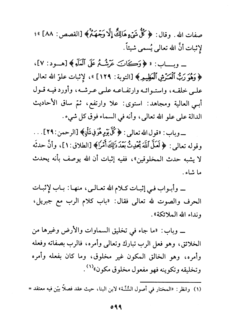 - وأبواباً في إثبات كلام الله تعالى، منها باب لإثبات الحرف والصوت لله تعالى فقال: باب كلام الرب مع جبريل، ونداء الله الملائكة.