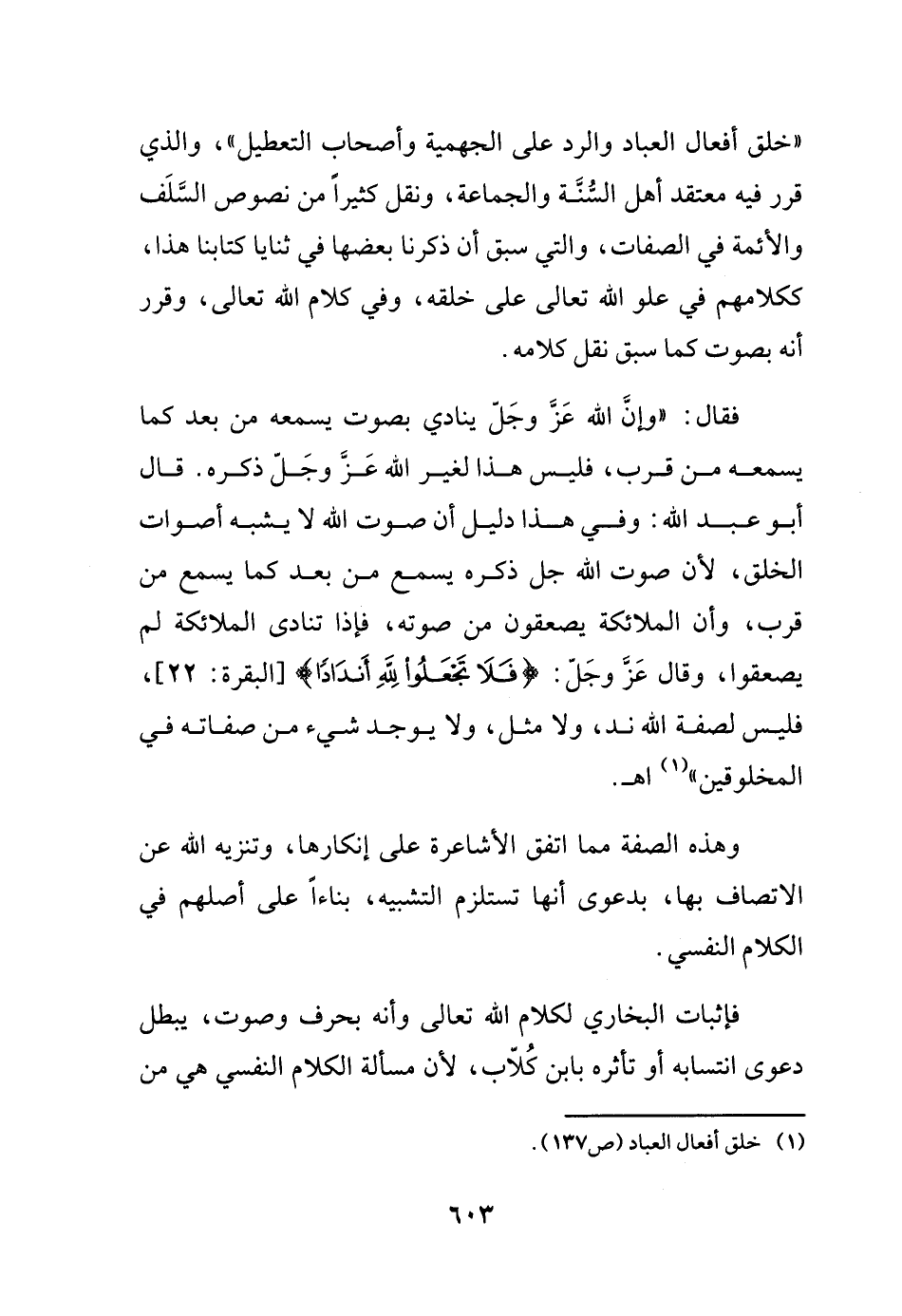 فإثبات البخاري لكلام الله تعالى وأنه بحرف وصوت، يبطل دعوى انتسابه أو تأثره بابن كلاب، لأن مسألة الكلام النفسي هي من