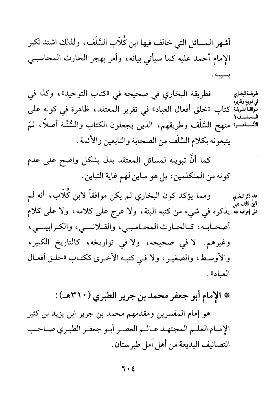 ومما يؤكد كون البخاري لم يكن موافقاً لابن كلاب، أنه لم يذكره في شيء من كتبه البتة، ولا عرج على كلامه، ولا على كلام أصحابه، كالحارث المحاسبي، والقلانسي، والكرابيسي، وغيرهم. لا في صحيحه، ولا في تواريخه، كالتاريخ الكبير، والأوسط، والصغير، ولا في كتبه الأخرى ككتاب "خلق أفعال العباد".