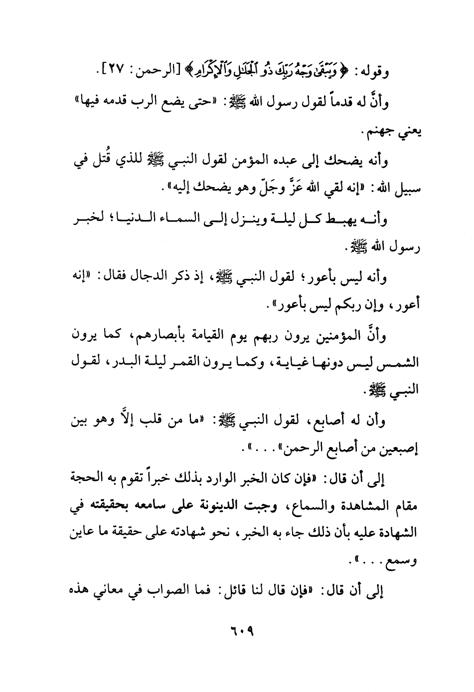 وقوله: {ويبقى وجه ربك ذو الجلال والإكرام} الرحمن27. وأن له قدماً لقول رسول الله - صلى الله عليه وسلم -: "حتى يضع الرب قدمه فيها" يعني جهنم. وأنه يضحك إلى عبده المؤمن لقول النبي - صلى الله عليه وسلم - للذي قُتل في سبيل الله: "إنه لقي الله عز وجل وهو يضحك إليه". وانه يهبط كل ليلة وينزل إلى السماء الدنيا، لخبر رسول الله - صلى الله عليه وسلم -. وأنه ليس بأعور لقول النبي - صلى الله عليه وسلم -، إذ ذكر الدجال فقال: "إنه أعور، وإن ربكم ليس بأعور".