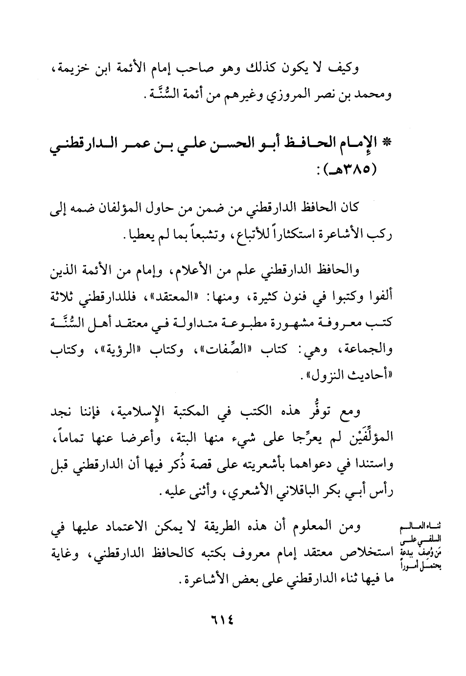 ومن المعلوم أن هذه الطريقة لا يمكن الاعتماد عليها في استخلاص معتقد إمام معروف بكتبه كالحافظ الدارقطني، وغاية ما فيها ثناء الدارقطني على بعض الأشاعرة،
