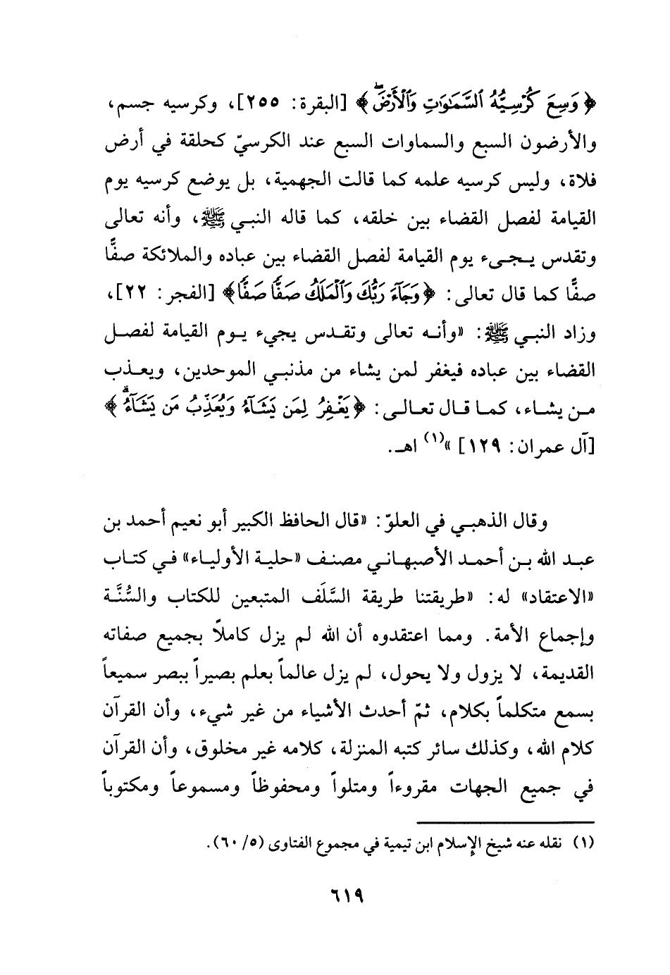 {وسع كرسيه السموات والأرض} البقرة255، وكرسيه جسم، والأرضون السبع والسموات السبع عند الكرسى كحلقة فى أرض فلاة، وليس كرسيه علمه كما قالت الجهمية، بل يوضع كرسيه يوم القيامة لفصل القضاء بين خلقه، كما قاله النبي - صلى الله عليه وسلم -، وأنه تعالى وتقدس يجىء يوم القيامة لفصل القضاء بين عباده والملائكة صفاً صفاً كما قال تعالى: {وجاء ربك والملك صفا صفا} الفجر22، وزاد النبى - صلى الله عليه وسلم -: وأنه تعالى وتقدس يجىء يوم القيامة لفصل القضاء بين عباده فيغفر لمن يشاء من مذنبى الموحدين، ويعذب من يشاء، كما قال تعالى: {يغفر لمن يشاء ويعذب من يشاء} آل عمران129) (¬1) اهـ.