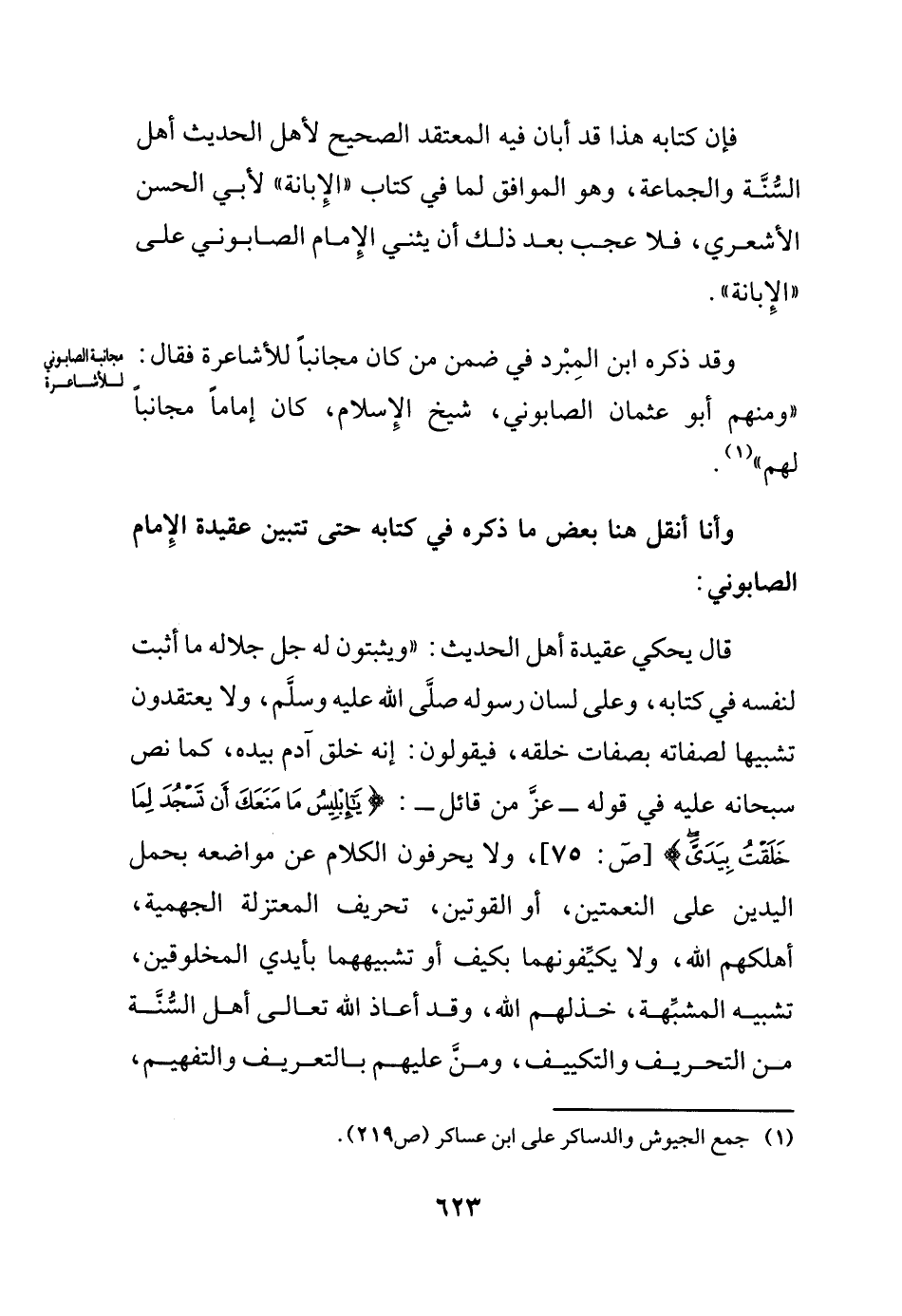 قال يحكي عقيدة أهل الحديث: (ويثبتون له جل جلاله ما أثبت لنفسه في كتابه، وعلى لسان رسوله صلى الله عليه وسم، ولا يعتقدون تشبيها لصفاته بصفات خلقه، فيقولون: إنه خلق آدم بيده، كما نص سبحانه عليه في قوله- عز من قائل: (يا إبليس ما منعك ان تسجد لما خلقت بيدي) ولا يحرفون الكلام عن مواضعه بحمل اليدين على النعمتين، أو القوتين، تحريف المعتزلة الجهمية، أهلكهم الله، ولا يكيفونهما بكيف أو تشبيههما بأيدي المخلوقين، تشبيه المشبهة، خذلهم الله، وقد أعاذ الله تعالى أهل السنة من التحريف والتكييف، ومن عليهم بالتعريف والتفهيم،