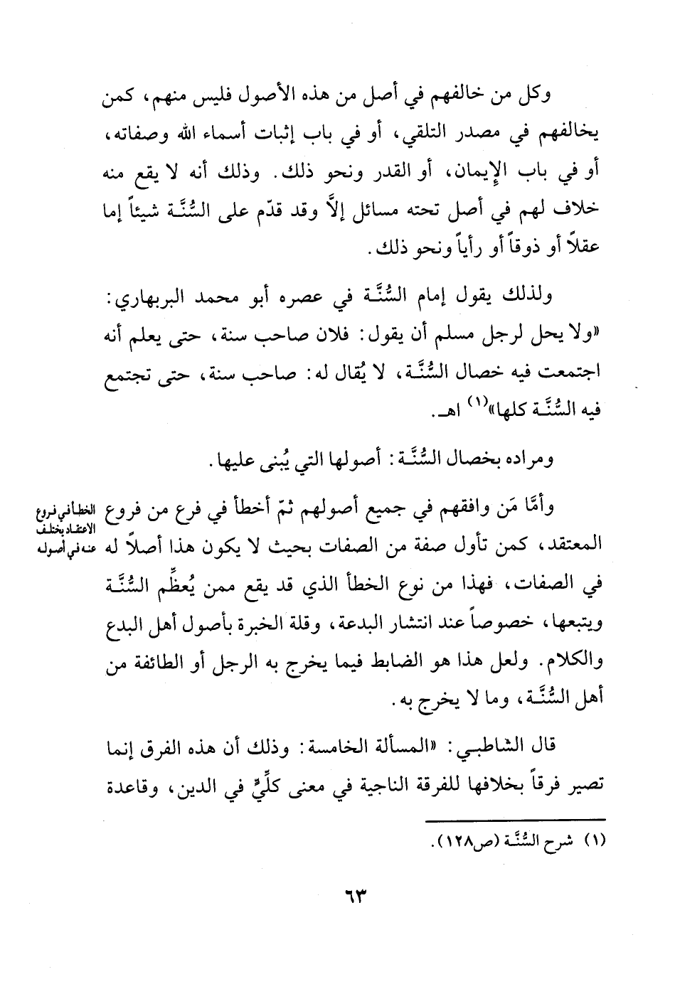 وقال إمام السنة في عصره أبو محمد البربهاري: (ولا يحل لرجل مسلم أن يقول: فلان صاحب سنة، حتى يعلم أنه اجتمعت فيه خصال السنة، لا يُقال له: صاحب سنة، حتى تجتمع فيه السنة كلها) (¬1) اهـ.