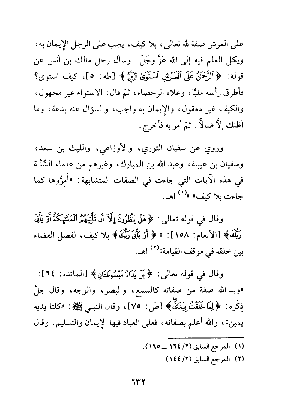 وروي عن سفيان الثوري، والأوزاعي، والليث بن سعد، وسفيان بن عيينة، وعبد الله بن المبارك، وغيرهم من علماء السنة في هذه الآيات التي جاءت في الصفات المتشابهة: أمِرّوها كما جاءت بلا كيف .. ) (¬1) اهـ.