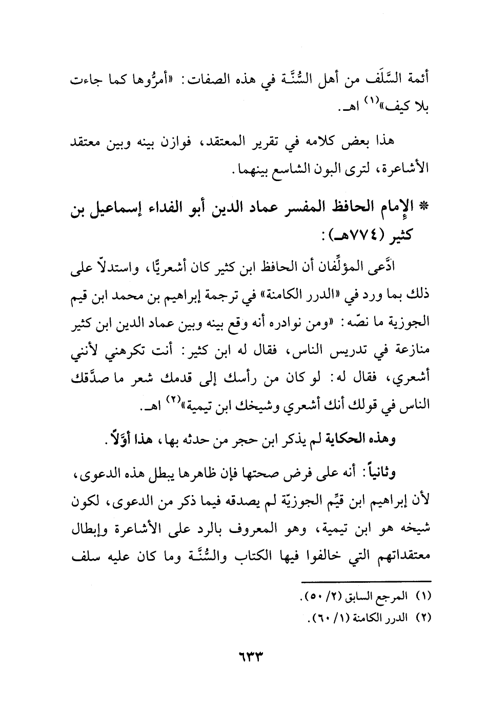 ادعى الأشعريان أن الحافظ ابن كثير كان أشعرياً، واستدلا على ذلك بما ورد في الدرر الكامنة في ترجمة ابراهيم ابن محمد ابن قيم الجوزية ما نصه: (ومن نوادره أنه وقع بينه وبين عماد الدين ابن كثير منازعة في تدريس الناس، فقال له ابن كثير: أنت تكرهني لأنني أشعري، فقال له: لو كان من رأسك إلى قدمك شعر ما صدقك الناس في قولك أنك أشعري وشيخك ابن تيمية) (¬2) اهـ.
