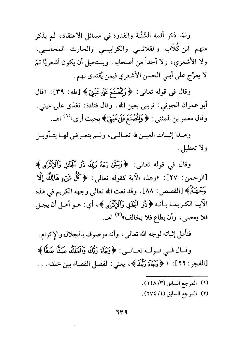 وهذا إثبات العين لله تعالى، ولم يتعرض لها بتأويل ولا تعطيل.