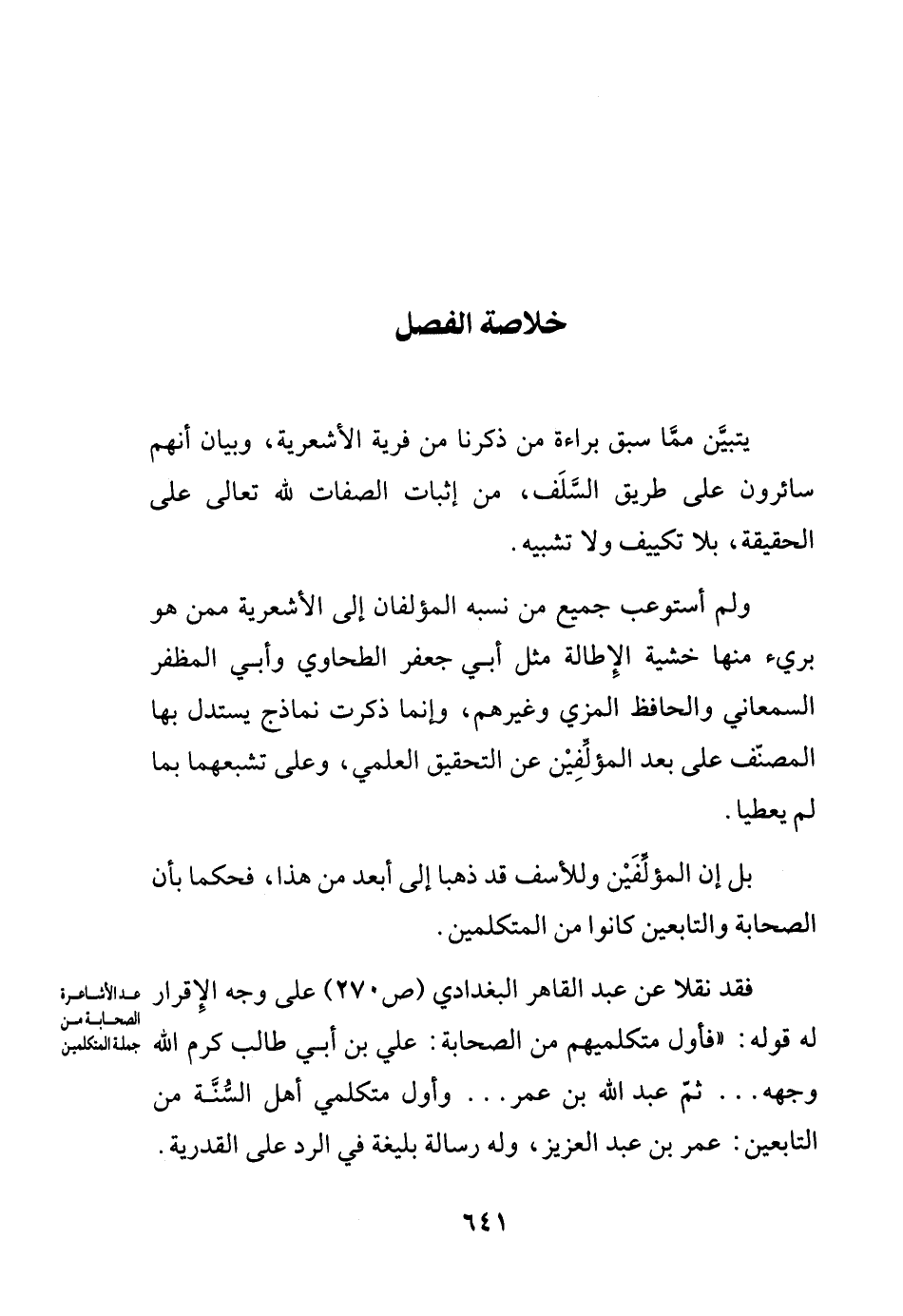 فقد نقلا عن عبد القادر البغدادي (ص270) على وجه الإقرار له قوله: (فأول متكلميهم من الصحابة: علي بن أبي طالب كرم الله وجهه .... ثم عبد الله بن عمر ... وأول متكلمي أهل السنة من التابعين: عمر بن عبد العزيز، وله رسالة بليغة في الرد على القدرية.