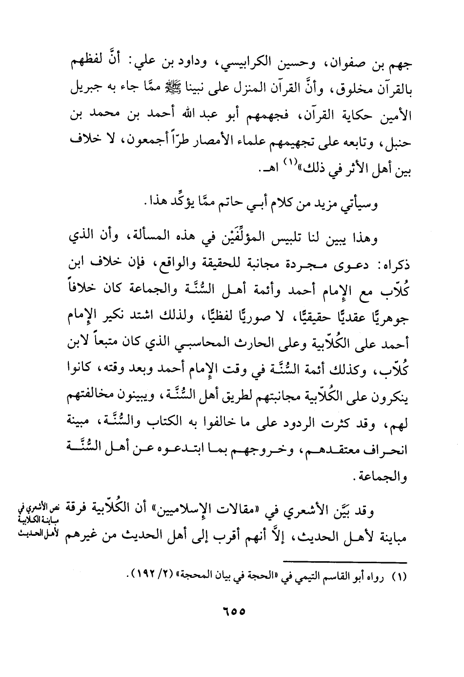 وهذا يبين لنا تلبيس الأشعريين في هذه المسألة، وأن ما قالاه دعوى مجردة مجانبة للحقيقة والواقع، فإن خلاف ابن كلاب مع الإمام أحمد وأئمة أهل السنة والجماعة كان خلافاً جوهرياً عقدياً حقيقياً، لا صورياً لفظياً، ولذلك اشتد نكير الإمام أحمد على الكلابية وعلى الحارث المحاسبي الذي كان متبعاً لابن كلاب، وكذلك أئمة السنة في وقت الإمام أحمد وبعد وقته ينكرون على الكلابية مجانبتهم لطريق أهل السنة، ويبينون مخالفتهم لهم، وقد كثرت الردود على ما خالفوا به الكتاب والسنة، مبينة انحراف معتقدهم، وخروجهم بما ابتدعوه عن أهل السنة والجماعة.