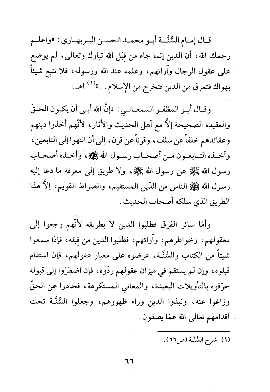قال إما السنة أبو محمد الحسن البربهاري: (واعلم رحمك الله، أن الدين إنما جاء من قِبَل الله تبارك وتعالى، لم يوضع على عقول الرجال وآرائهم، وعلمه عند الله ورسوله، فلا تتبع شيئاً بهواك فتمرق من الدين فتخرج من الإسلام ... ) (¬1) اهـ.