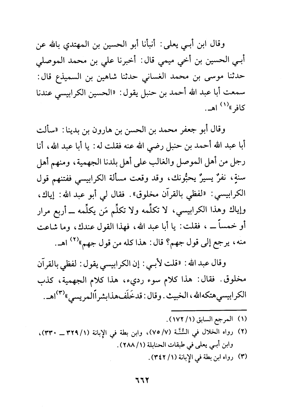 (¬2) رواه الخلال في السنة (7/ 75) وابن بطة في الإبانة (1/ 329 - 330) وابن أبي يعلى في طبقات الحنابلة (1/ 288).