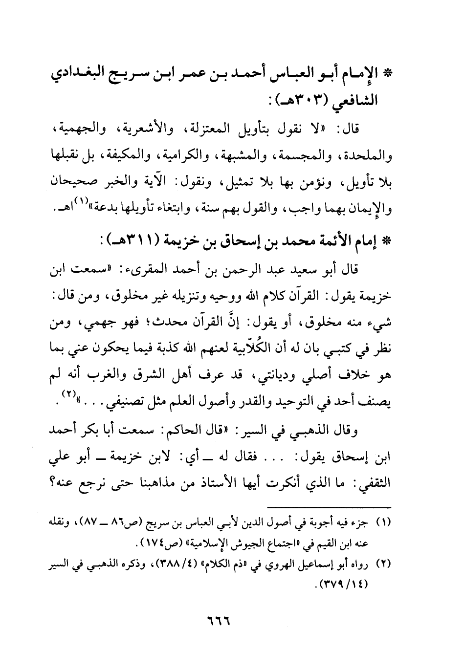 قال أبو سعيد عبد الرحمن بن أحمد المقرئ، سمعت ابن خزيمة يقول: القرآن كلام الله ووحيه وتنزيله غير مخلوق، ومن قال: شيء منه مخلوق، أو يقول: إن القرآن محدث فهو جهمي، ومن نظر في كتبي بان له أن الكلابية لعنهم الله كذبة فيما يحكون عني بما هو خلاف أصلي وديانتي، قد عرف أهل الشرق والغرب أنه لم يصنف أحد في التوحيد والقدر وأصول العلم مثل تصنيفي ... ).
