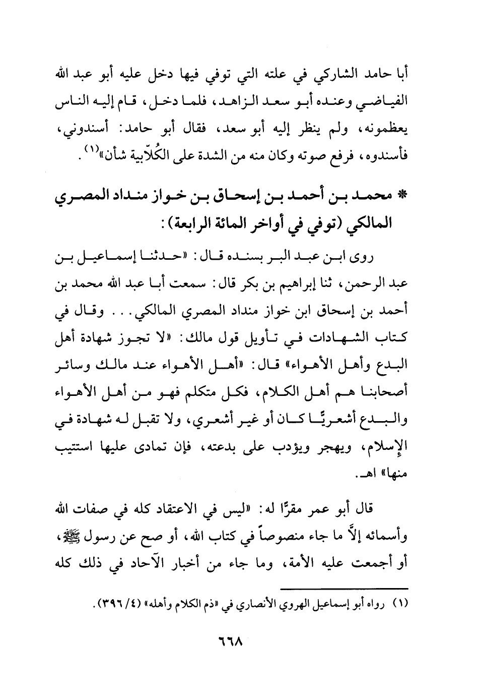 روى ابن عبد البر بسنده قال: (حدثنا إسماعيل بن عبد الرحمن ثنا إبراهيم بن بكر قال: سمعت أبا عبد الله محمد بن أحمد بن إسحاق بن خواز منداد المصري المالكي .... وقال في كتاب الشهادات في تأويل قول مالك: "لا تجوز شهادة أهل البدع وأهل الأهواء" قال: (أهل الأهواء عند مالك وسائر أصحابنا هم أهل الكلام، فكل متكلم فهو من أهل الأهواء والبدع أشعرياً كان أو غير أشعري، ولا تقبل له شهادة في الإسلام، ويهجر ويؤدب على بدعته، فإن تمادى عليها استتيب منها) اهـ.