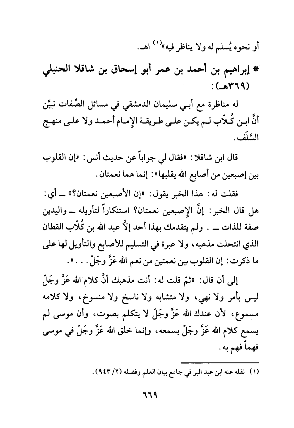 فقلت له: هذا الخبر يقول: "إن الأصبعين نعمتان؟ " -أي: هل قال الخبر: إن الإصبعين نعمتان؟ استنكاراً لتأويله- واليدين صفة للذات. ولم يتقدمك بهذا أحد إلا عبد الله بن كلاب القطان الذي انتحلت مذهبه، ولا عبرة في التسليم للأصابع والتأويل لها على ما ذكرت: إن القلوب بين نعمتين من نعم الله عز وجل ...... ) إلى أن قال: