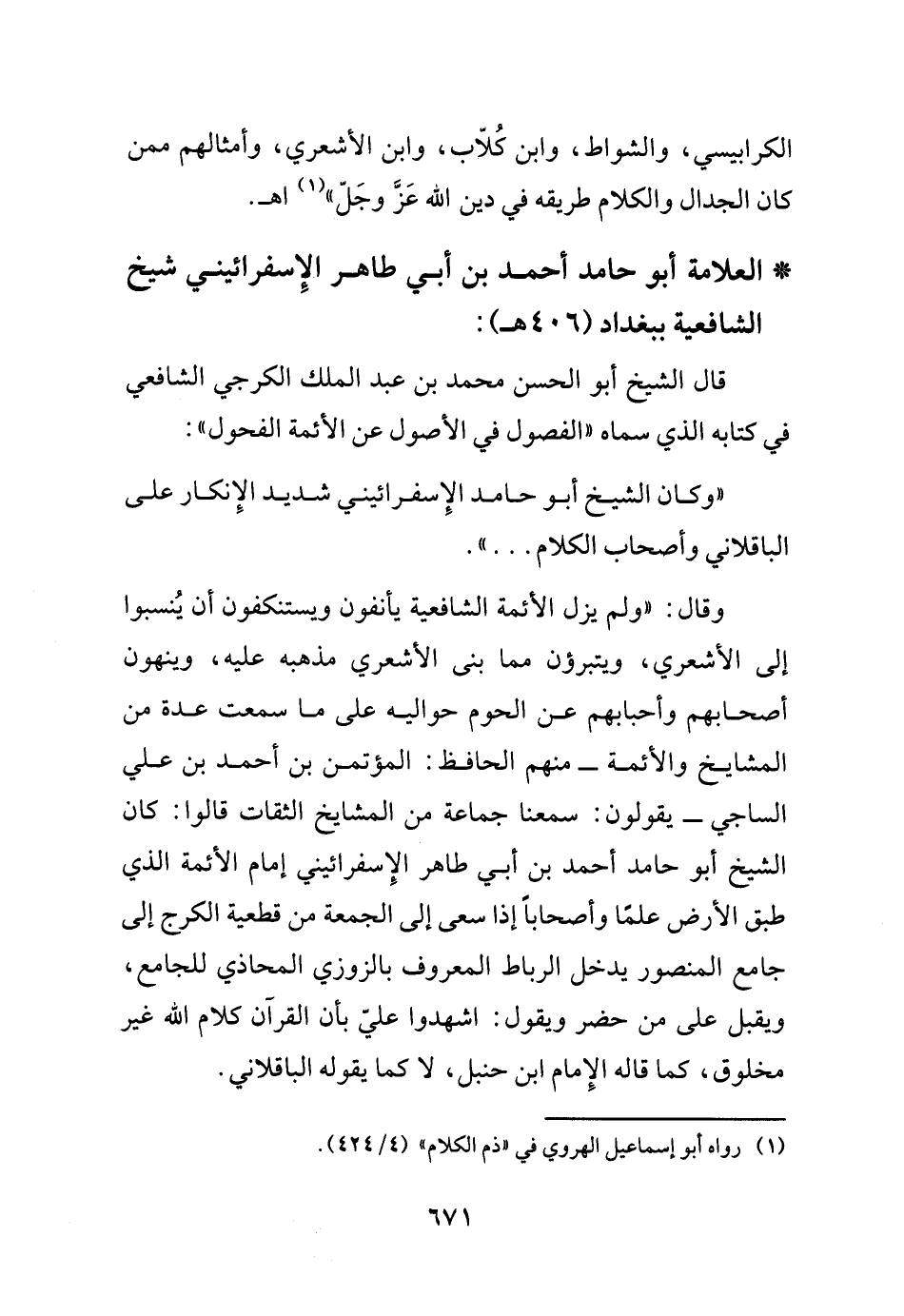 وقال: (ولم يزل الأئمة الشافعية يأنفون ويستنكفون أن ينسبوا إلى الأشعري، ويتبرؤن مما بنى الأشعري مذهبه عليه، وينهون أصحابهم وأحبابهم عن الحوم حواليه على ما سمعت عدة من المشايخ والأئمة، منهم الحافظ المؤتمن بن أحمد بن على الساجي يقولون: سمعنا جماعة من المشايخ الثقات قالوا: كان الشيخ أبو حامد أحمد بن أبي طاهر الإسفرائيني إمام الأئمة الذي طبق الأرض علمًا وأصحاباً إذا سعى إلى الجمعة من قطعية الكرج إلى جامع المنصور يدخل الرباط المعروف بالزوزي المحاذي للجامع، ويقبل على من حضر ويقول: اشهدوا عليّ بأن القرآن كلام الله غير مخلوق، كما قاله الإمام ابن حنبل، لا كما يقوله الباقلاني،