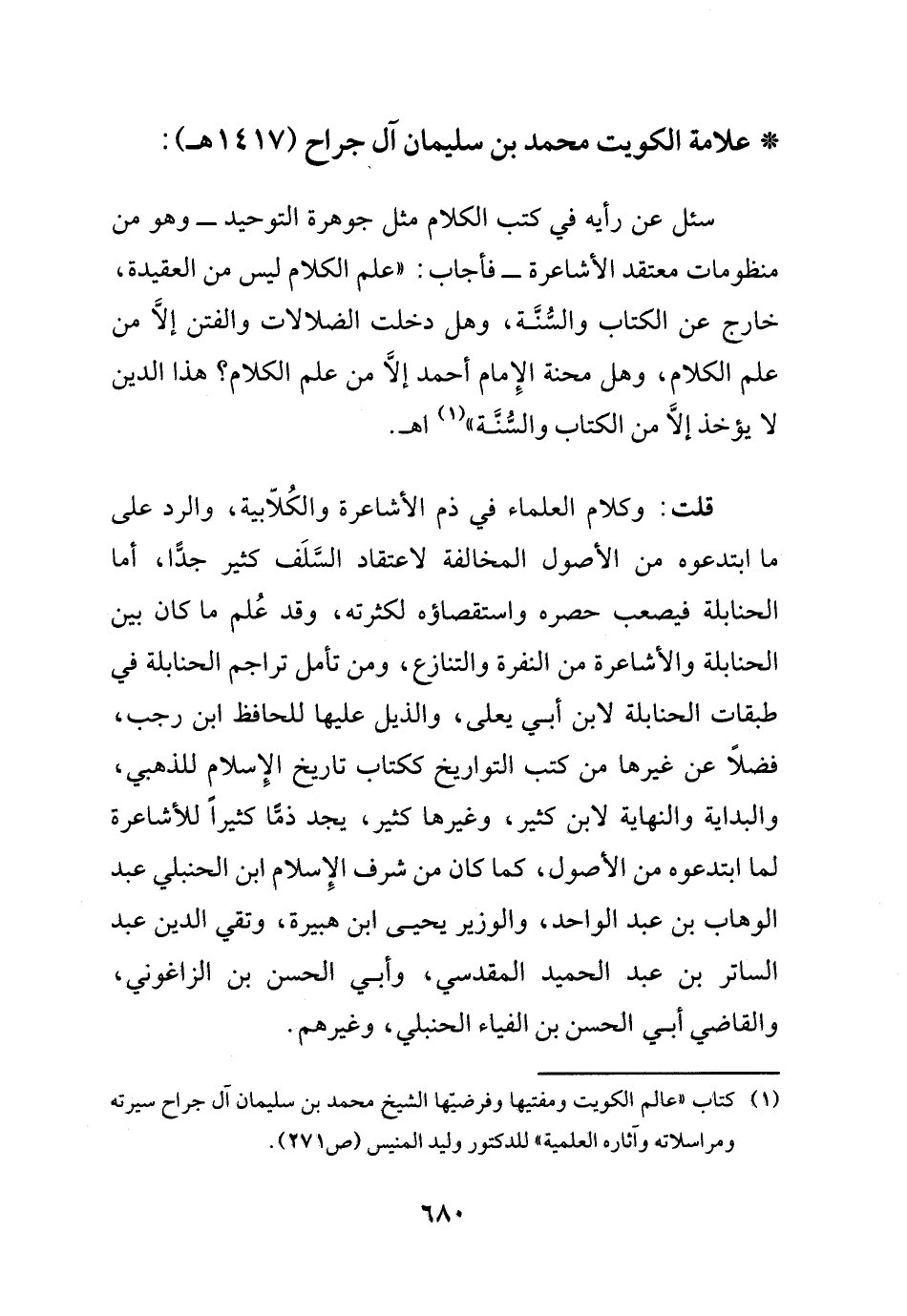 قلت: وكلام العلماء في ذم الأشاعرة والكلابية، والرد على ما ابتدعوه من الأصول المخالفة لاعتقاد السلف كثير جداً، أما الحنابلة فيصعب حصره واستقصائه لكثرته، وقد عُلم ما كان بين الحنابلة والأشاعرة من النفرة والتنازع، ومن تأمل تراجم الحنابلة في طبقات الحنابلة لابن أبي يعلى، والذيل عليها للحافظ ابن رجب، فضلاً عن غيرها من كتب التواريخ ككتاب تاريخ الإسلام للذهبي، والبداية والنهاية لابن كثير، وغيرها كثير، كما كان من شرف الإسلام ابن الحنبلي عبد الوهاب بن عبد الواحد، والوزير يحيى ابن هبيرة، وتقي الدين عبد الساتر بن عبد الحميد المقدسي، وأبي الحسن بن الزاغوني، والقاضي أبي الحسن بن الفياء الحنبلي، وغيرهم.