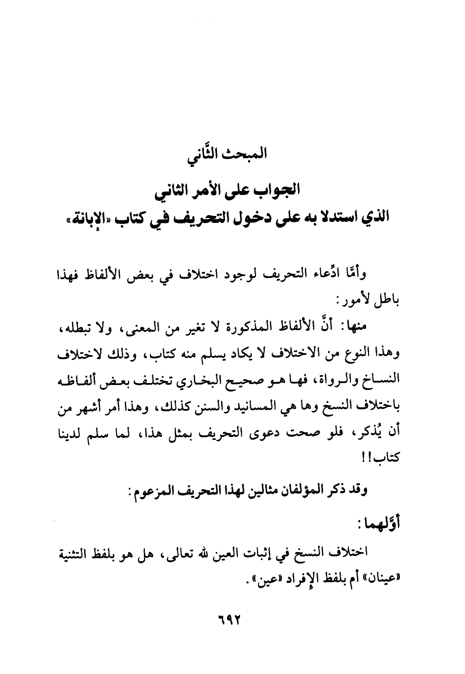 الجواب على الأمر الثاني الذي استدلا به على دخول التحريف في كتاب "الإبانة"