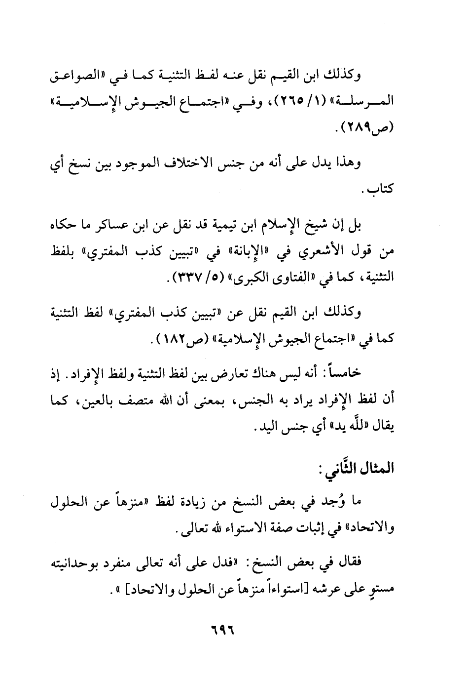 وكذا ان القيم نقل عن تبيين كذب المفتري لفظ التثنية كما في اجتماع الجيوش الإسلامية (ص182).