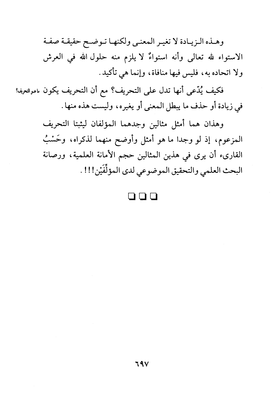 وهذان هما أمثل مثالين وجدهما الأشعريان ليثبتا التحريف المزعوم، إذ لو وجدا ما هو أمثل وأوضح منهما لذكراه، وحسب القارئ أن يرى في هذين المثالين حجم الأمانة العلمية، ورصانة البحث العلمي والتحقيق الموضوعي لدى صاحبينا الأشعريين!!!.