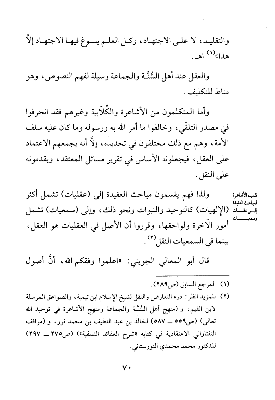 (¬1) للمزيد انظر: درء التعارض والنقل لشيخ الإسلام ابن تيمية، والصواعق المرسلة لابن القيم، و (منهج أهل السنة والجماعة ومنهج الأشاعرة في توحيد الله تعالى) (ص559 - 587) لخالد بن عبد اللطيف بن محمد نور، و (مواقف التفتازاني الاعتقادية في كتابه "شرح العقائد النسفية") (ص275 - 297) للدكتور محمد محمدي النورستاني.