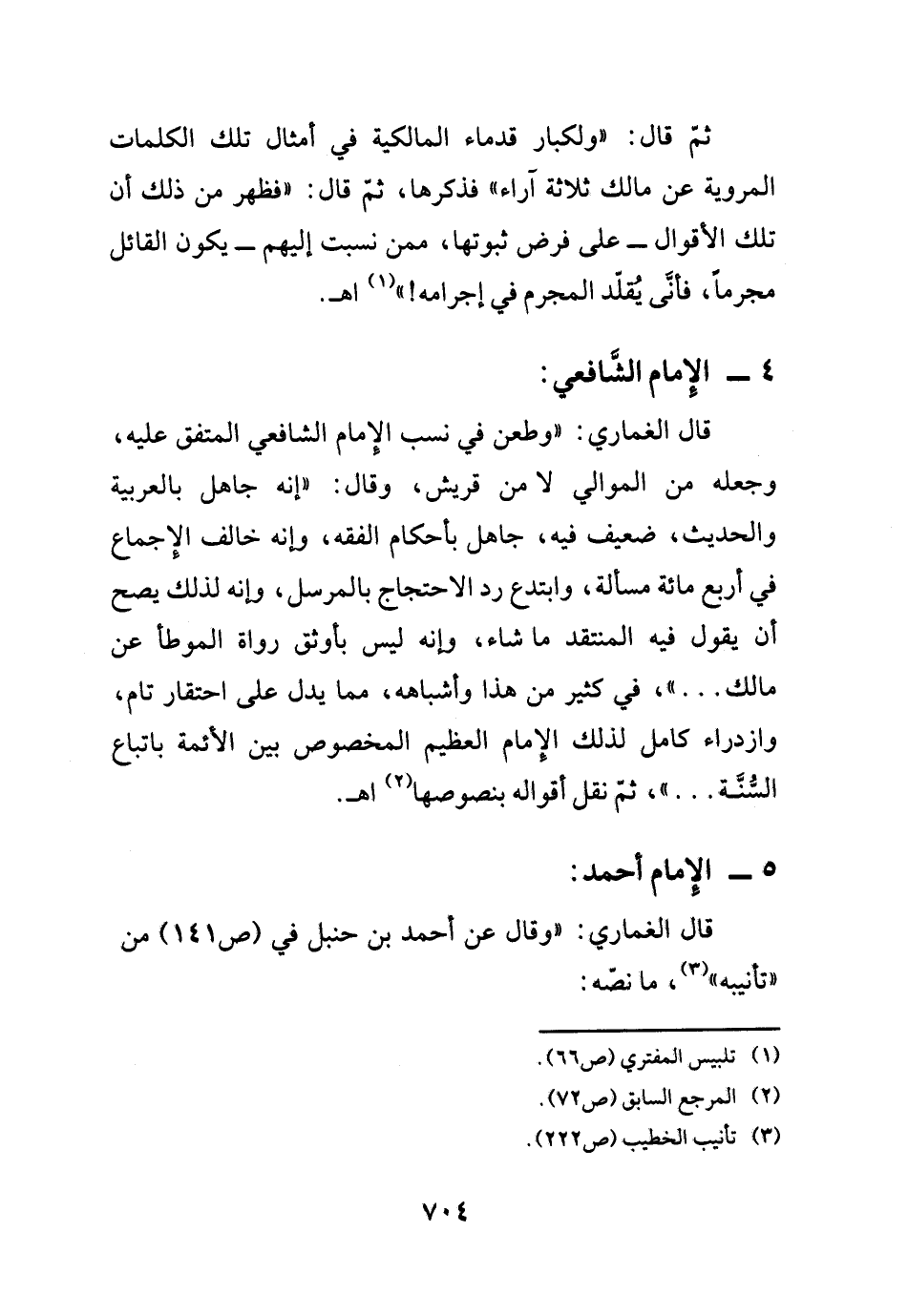 ثم قال: "ولكبار قدماء المالكية في أمثال تلك الكلمات المروية عن مالك ثلاثة آراء" فذكرها، ثم قال: "فظهر من ذلك أن تلك الأقوال -على فرض ثبوتها، ممن نسبت إليهم- يكون القائل مجرماً، فأنى يُقلد المجرم في إجرامه! ".) (¬1) اهـ.