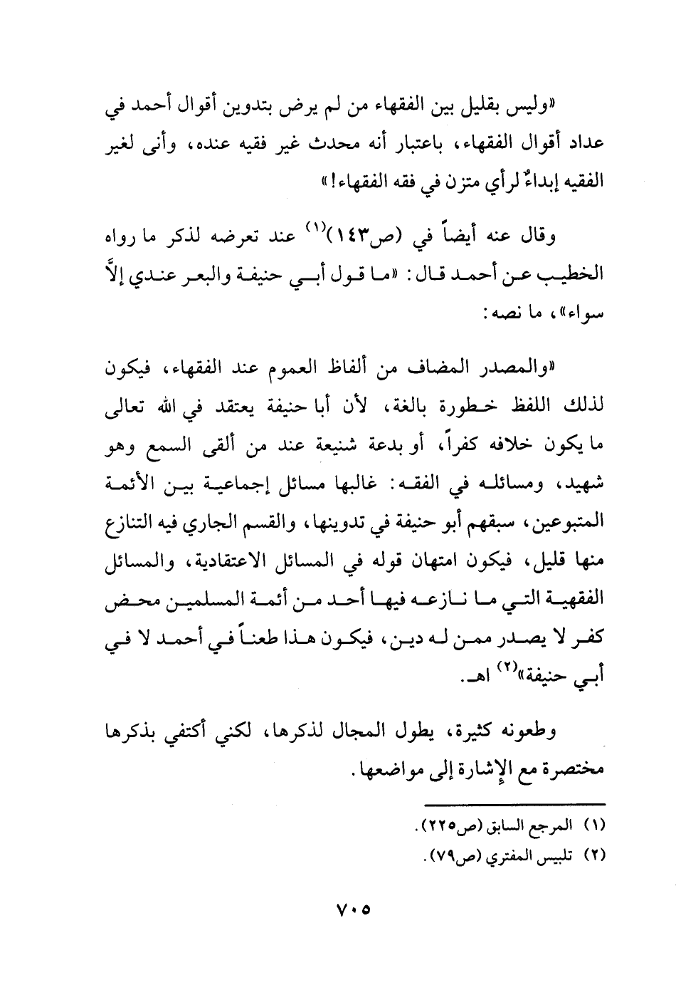 "والمصدر المضاف من ألفاظ العموم عند الفقهاء، فيكون لذلك اللفظ خطورة بالغة، لأن أبا حنيفة يعتقد في الله تعالى ما يكون خلافه كفراً، أو بدعة شنيعة عند من ألقى السمع وهو شهيد، ومسائله في الفقه: غالبها مسائل إجماعية بين الأئمة المتبوعين، سبقهم أبو حنيفة في تدوينها، والقسم الجاري فيه التنازع منها قليل، فيكون امتهان قوله في المسائل الاعتقادية، والمسائل الفقهية التي ما نازعه فيها أحد من أئمة المسلمين محض كفر لا يصدر ممن له دين، فيكون هذا طعناً في أحمد لا في أبي حنيفة .. ) (¬2) اهـ.