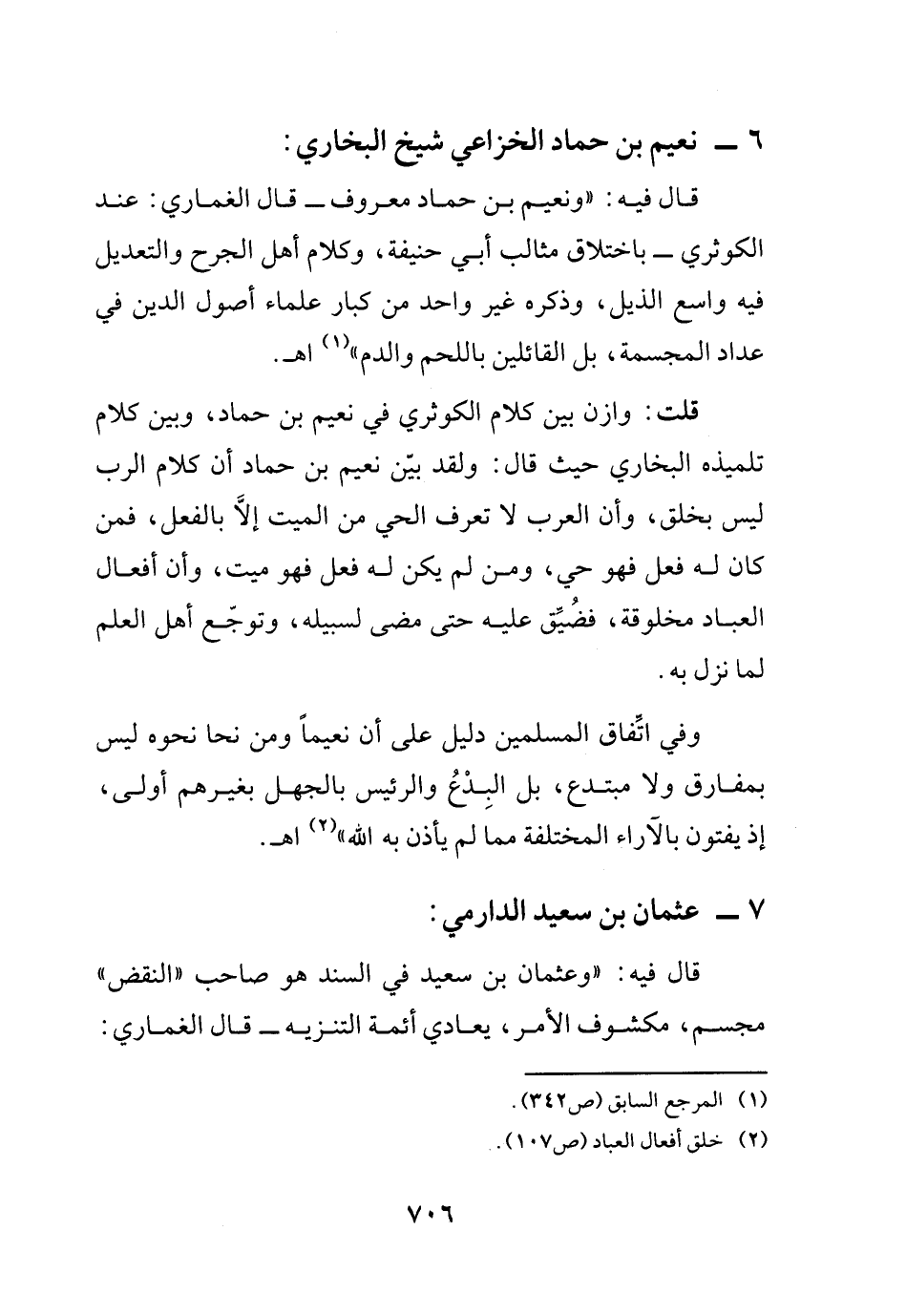 قلت: فوازن بين كلام الكوثري في نعيم بن حماد، وبين كلام تلميذه البخاري حيث قال: (قال أبو عبد الله: ولقد بيّن نعيم بن حماد أن كلام الرب ليس بخلق، وأن العرب لا تعرف الحي من الميت إلا بالفعل، فمن كان له فعل فهو حي، ومن لم يكن له فعل فهو ميت، وأن أفعال العباد مخلوقة، فضُيَّق عليه حتى مضى لسبيله، وتوجّع أهل العلم لما نزل به.