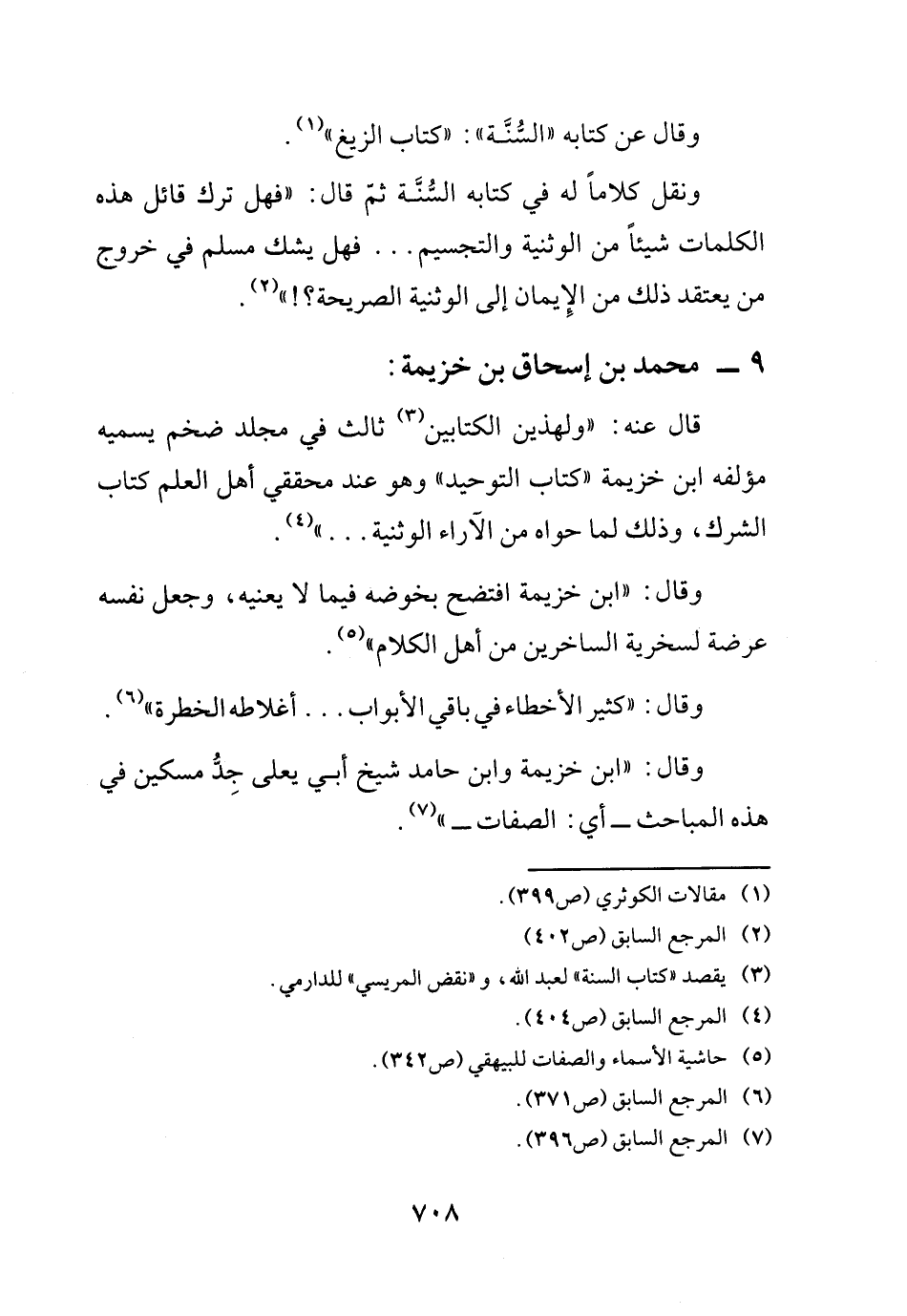 وقال: (ابن خزيمة وابن حامد شيخ أبي يعلى جد مسكين في هذه المباحث - أي الصفات -). (¬4)