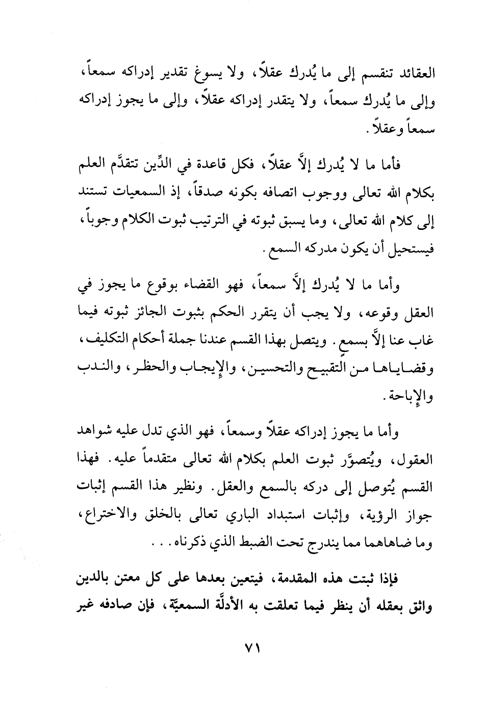 العقائد تنقسم إلى ما يُدرك عقلاً، ولا يسوغ تقدير إدراكه سمعاً، وإلى ما يُدرك سمعاً، ولا يتقدر إدراكه عقلاً، وإلى ما يجوز إدراكه سمعاً وعقلاً.