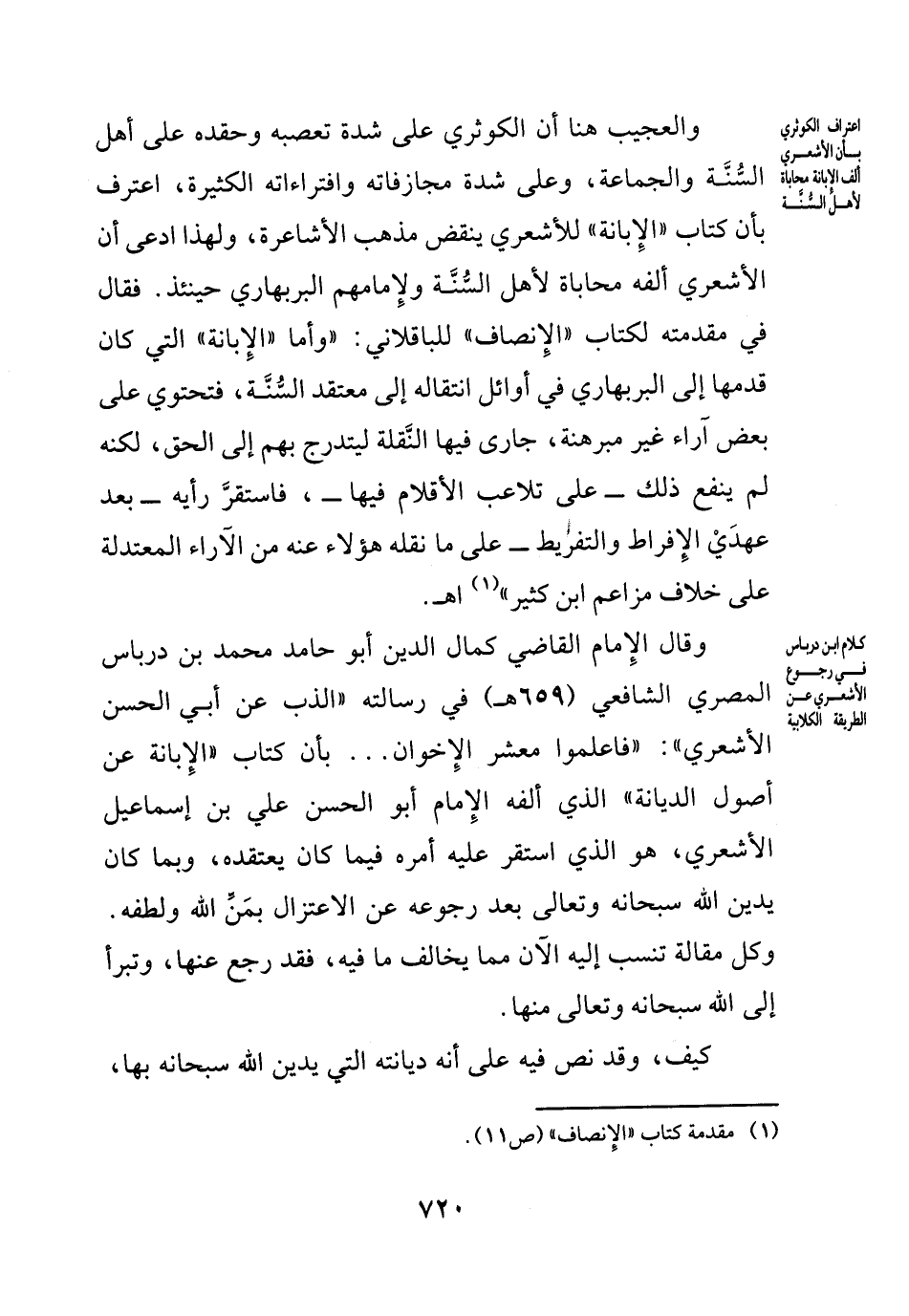 وقال الإمام القاضي كمال الدين أبو حامد محمد بن درباس المصري الشافعي (659 هـ) في رسالته "الذب عن أبي الحسن الأشعري": (فاعلموا معشر الإخوان ... بأن كتاب "الإبانة عن أصول الديانة" الذي ألفه الإمام أبو الحسن علي بن إسماعيل الأشعري، هو الذي استقر عليه أمره فيما كان يعتقده، وبما كان يدين الله سبحانه وتعالى بعد رجوعه عن الاعتزال بمن الله ولطفه. وكل مقالة تنسب إليه الآن مما يخالف ما فيه، فقد رجع عنها، وتبرأ إلى الله سبحانه وتعالى منها. كيف وقد نص فيه على أنه ديانته التي يدين الله سبحانه بها،