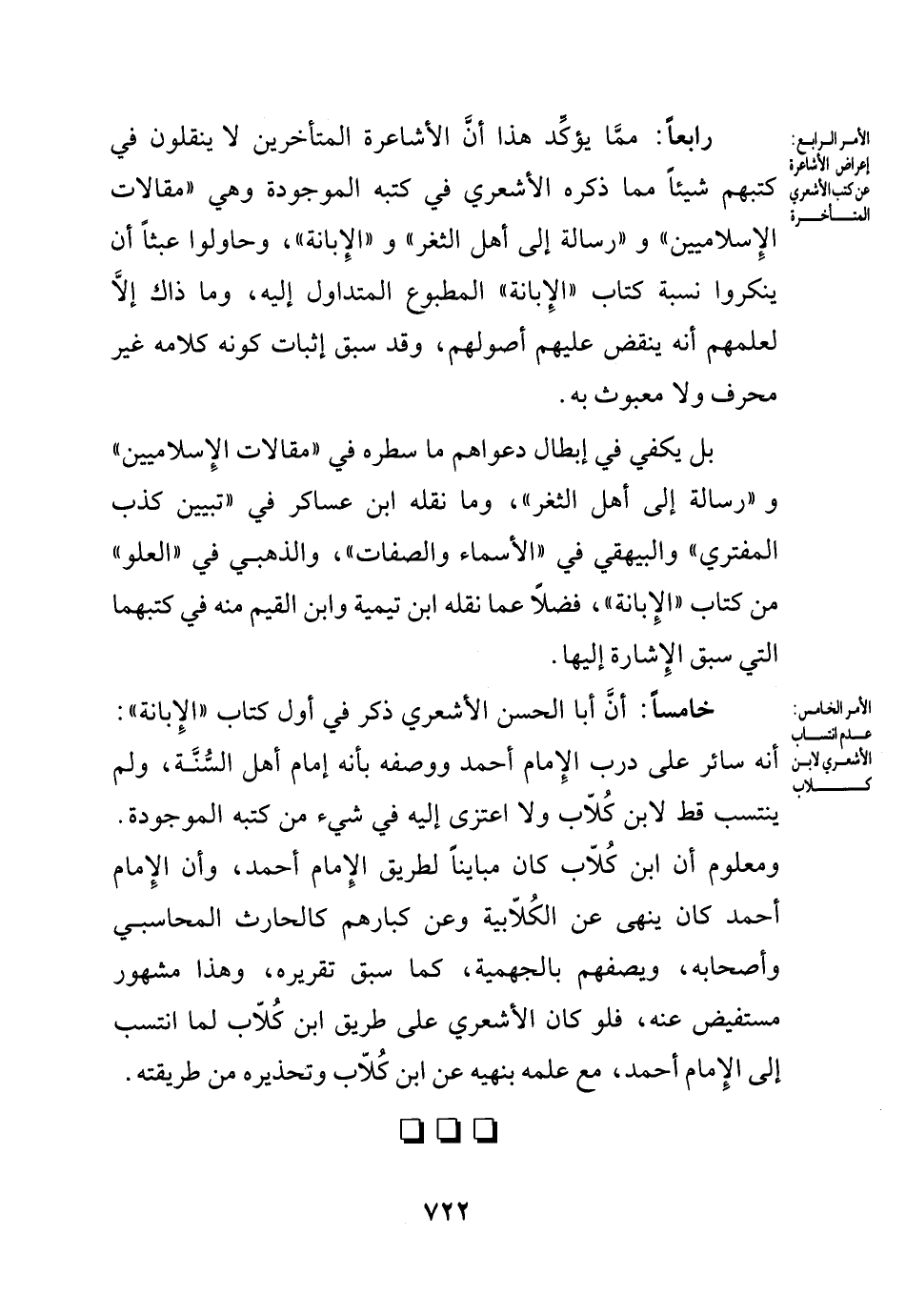 خامساً: أن أبا الحسن الأشعري ذكر في أول كتاب الإبانة: أنه سائر على درب الإمام أحمد ووصفه بأنه إمام أهل السنة، ولم ينتسب قط لابن كلاب ولا اعتزى إليه في شيء من كتبه الموجودة. ومعلوم أن ابن كلاب كان مبايناً لطريق الإمام أحمد، وأن الإمام أحمد كان ينهى عن الكلابية وكبارهم كالحارث المحاسبي وأصحابه، ويصفهم بالجهمية، كما سبق تقريره، وهذا مشهور مستفيض عنه، فلو كان الأشعري على طريق ابن كلاب لما انتسب إلى الإمام أحمد، مع علمه بنهيه عن ابن كلاب وتحذيره من طريقته.