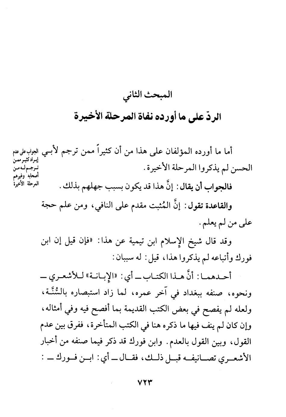 أحدهما: أن هذا الكتاب -أي الإبانة للأشعري- ونحوه صنفه ببغداد في آخر عمره لما زاد استبصاره بالسنة، ولعله لم يفصح في بعض الكتب القديمة بما أفصح فيه وفي أمثاله، وإن كان لم ينف فيها ما ذكره هنا في الكتب المتأخرة، ففرق بين عدم القول، وبين القول بالعدم. وابن فورك قد ذكر فيما صنفه من أخبار الأشعري تصانيفه قبل ذلك، فقال -أي ابن فورك: