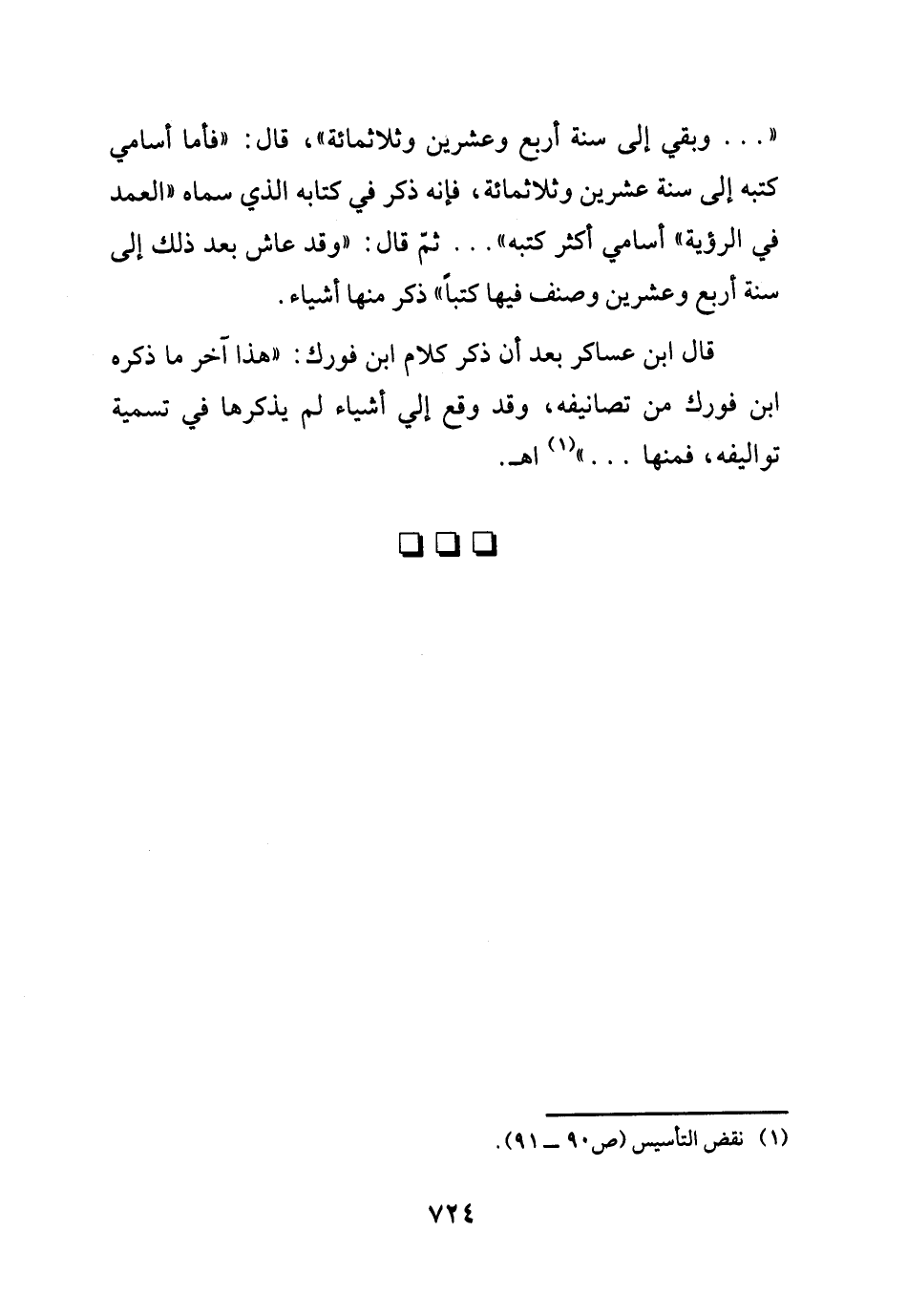 " ..... وبقي إلى سنة أربع وعشرين وثلاثمائة"، قال: "فاما أسامي كتبه إلى سنة عشرين وثلاثمائة، فإنه ذكر في كتابه الذي سماه العمد في الرؤية أسامي أكثر كتبه" ... ثم قال: "وقد عاش بعد ذلك إلى سنة أربع وعشرين وصنف فيها كتباً" ذكر منها أشياء. قال ابن عساكر بعد أن ذكر كلام ابن فورك: "هذا آخر ما ذكره ابن فورك من تصانيفه، وقد وقع إلي أشياء لم يذكرها في تسمية تواليفه، فمنها .... ") (¬1) اهـ.