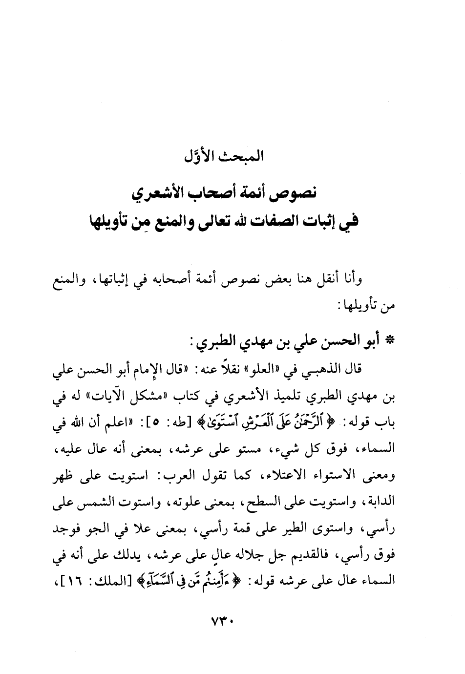 قال الذهبي في "العلو" نقلاً عنه: قال الإمام أبو الحسن علي بن مهدي الطبري تلميذ الأشعري في كتاب "مشكل الآيات" له في باب قوله {الرحمن على العرش استوى} طه5: (اعلم أن الله في السماء، فوق كل شيء، مستو على عرشه، بمعنى أنه عال عليه، ومعنى الاستواء الاعتلاء، كما تقول العرب: استويت على ظهر الدابة، واستويت على السطح، بمعنى علوته، واستوت الشمس على رأسي، واستوى الطير على قمة رأسي، بمعنى علا في الجو فوجد فوق رأسي، فالقديم جل جلاله عالٍ على عرشه، يدلك على أنه في السماء عال على عرشه قوله {أأمنتم من في السماء} الملك16،