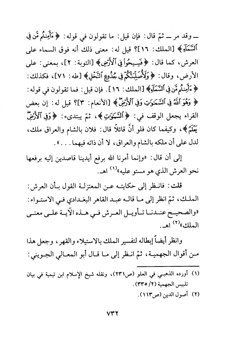 وانظر أيضاً إبطاله لتفسير الملك بالاستيلاء والقهر، وجعل هذا من أقوال الجهمية، ثم انظر إلى ما قال أبو المعالي الجويني: