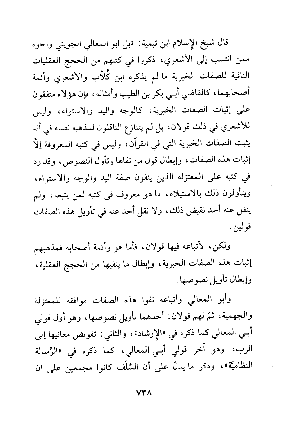 وقال شيخ الإسلام ابن تيمية: (بل أبو المعالي الجويني ونحوه ممن انتسب إلى الأشعري، ذكروا في كتبهم من الحجج العقليات النافية للصفات الخبرية ما لم يذكره ابن كلاب والأشعري وأئمة أصحابهما، كالقاضي أبي بكر بن الطيب وأمثاله، فإن هؤلاء متفقون على إثبات الصفات الخبرية، كالوجه واليد والاستواء، وليس للأشعري في ذلك قولان، بل لم يتنازع الناقلون لمذهبه نفسه في أنه يثبت الصفات الخبرية التي في القرآن، وليس في كتبه المعروفة إلا إثبات هذه الصفات، وإبطال قول من نفاها وتأول النصوص، وقد رد في كتبه على المعتزلة الذين ينفون صفة اليد والوجه والاستواء، ويتأولون ذلك بالاستيلاء، ما هو معروف في كتبه لمن يتبعه، ولم ينقل عنه أحد نقيض ذلك، ولا نقل أحد عنه في تأويل هذه الصفات قولين.