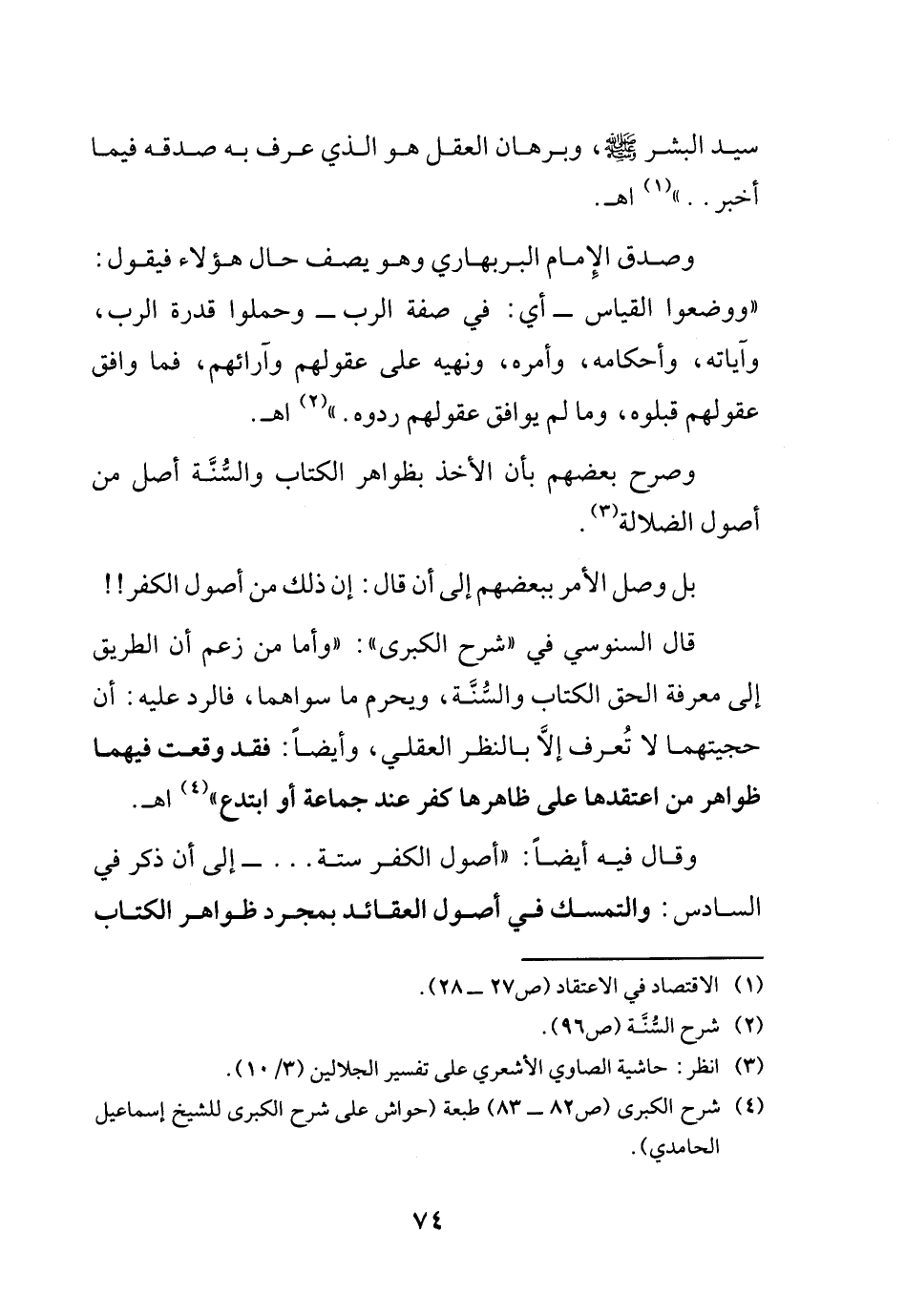 قال السنوسي في "شرح الكبرى": (وأما من زعم أن الطريق إلى معرفة الحق الكتاب والسنة، ويحرم ما سواهما، فالرد عليه: أن حجيتهما لا تُعرف إلا بالنظر العقلي، وأيضاً: فقد وقعت فيهما ظواهر من اعتقدها على ظاهرها كفر عند جماعة أو ابتدع) (¬4) اهـ.