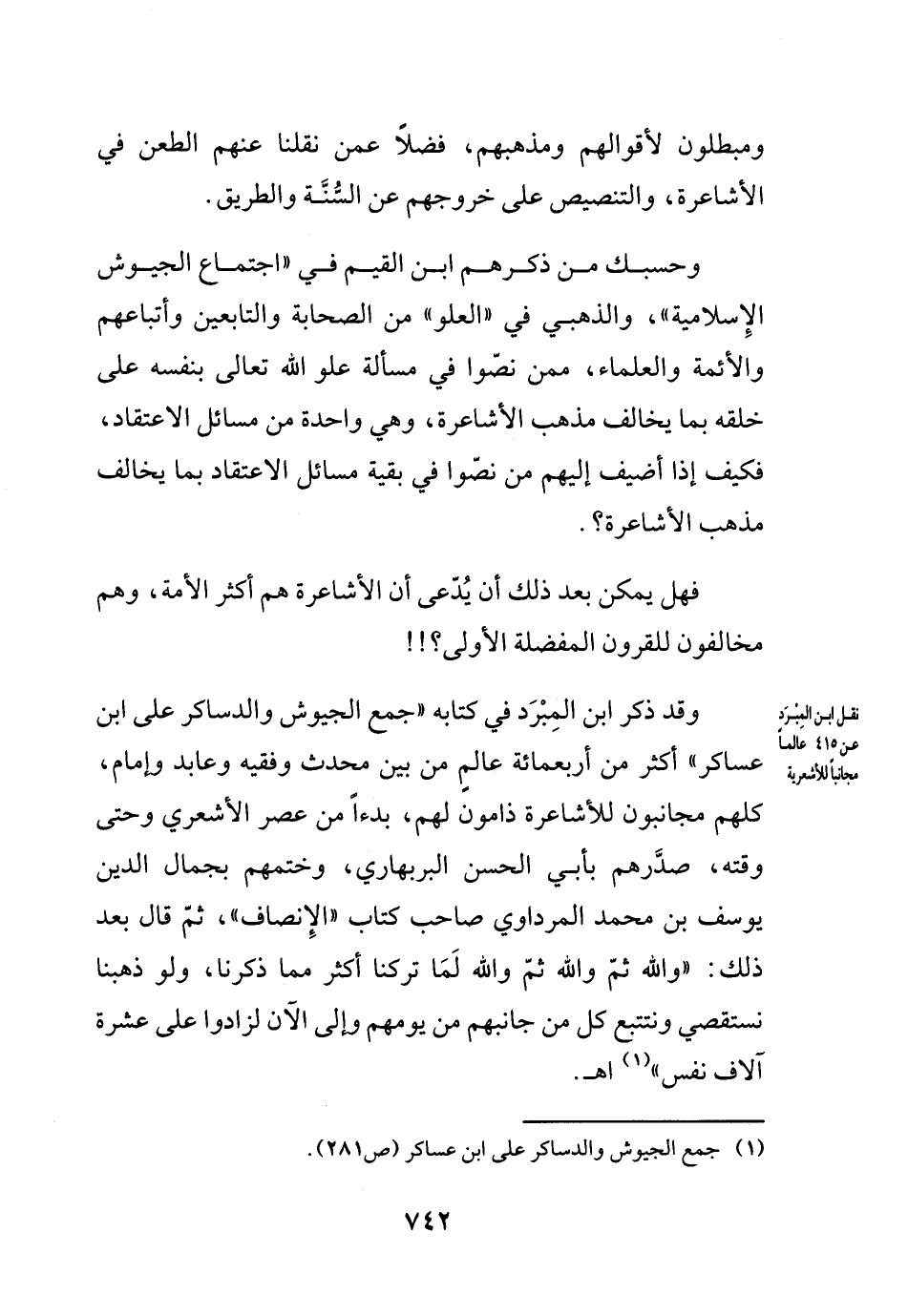 وحسبك من ذكرهم ابن القيم في "اجتماع الجيوش الإسلامية"، والذهبي في "العلو" من الصحابة والتابعين وأتباعهم والأئمة والعلماء، ممن نصوا في مسألة علو الله تعالى بنفسه على خلقه بما يخالف مذهب الأشاعرة، وهي واحدة من مسائل الاعتقاد، فكيف إذا أضيف لهم من نصوا في بقية مسائل الاعتقاد بما يخالف مذهب الأشاعرة؟.