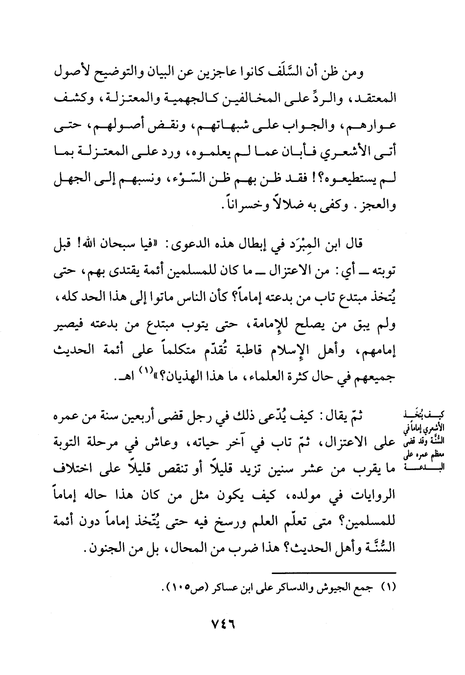 ومن ظن أن السلف كانوا عاجزين عن البيان والتوضيح لأصول المعتقد، والرد على المخالفين كالجهمية والمعتزلة، وكشف عوارهم، والجواب على شبهاتهم، ونقض أصولهم، حتى أتى الأشعري فأبان عما لم يعلموه، ورد على المعتزلة بما لم يستطيعوه؟! فقد ظن بهم ظن السّوْء، ونسبهم إلى الجهل والعجز. وكفى به ضلالاً وخسراناً.