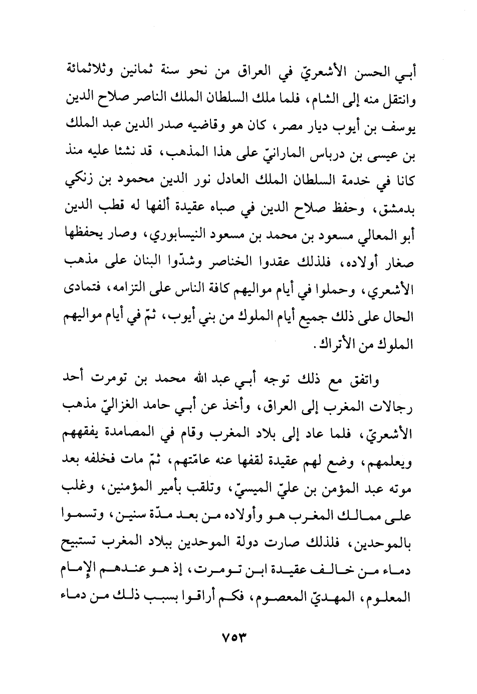(فانتشر مذهب أبي الحسن الأشعريّ في العراق من نحو سنة ثمانين وثلاثمائة وانتقل منه إلى الشام، فلما ملك السلطان الملك الناصر صلاح الدين يوسف بن أيوب ديار مصر، كان هو وقاضيه صدر الدين عبد الملك بن عيسى بن درباس المارانيّ على هذا المذهب، قد نشآ عليه منذ كانا في خدمة السلطان الملك العادل نور الدين محمود بن زنكي بدمشق، وحفظ صلاح الدين في صباه عقيدة ألفها له قطب الدين أبو المعالي مسعود بن محمد بن مسعود النيسابوري، وصار يحفظها صغار أولاده، فلذلك عقدوا الخناصر وشدّوا البنان على مذهب الأشعري، وحملوا في أيام مواليهم كافة الناس على التزامه، فتمادى الحال على ذلك جميع أيام الملوك من بني أيوب، ثم في أيام مواليهم الملوك من الأتراك، واتفق مع ذلك توجه أبي عبد الله محمد بن تومرت أحد رجالات المغرب إلى العراق، وأخذ عن أبي حامد الغزاليّ مذهب الأشعريّ، فلما عاد إلى بلاد المغرب وقّام في المصامدة يفقههم ويعلمهم، وضع لهم عقيدة لقفها عنه عامّتهم، ثم مات فخلفه بعد موته عبد المؤمن بن عليّ الميسيّ، وتلقب بأمير المؤمنين، وغلب على ممالك المغرب هو وأولاده من بعد مدّة سنين، وتسموا بالموحدين، فلذلك صارتّ دولة الموحدين ببلاد المغرب تستبيح دماء من خالف عقيدة ابن تومرت، إذ هو عندهم الإمام المعلوم، المهديّ المعصوم، فكم أراقوا بسبب ذلك من دماء