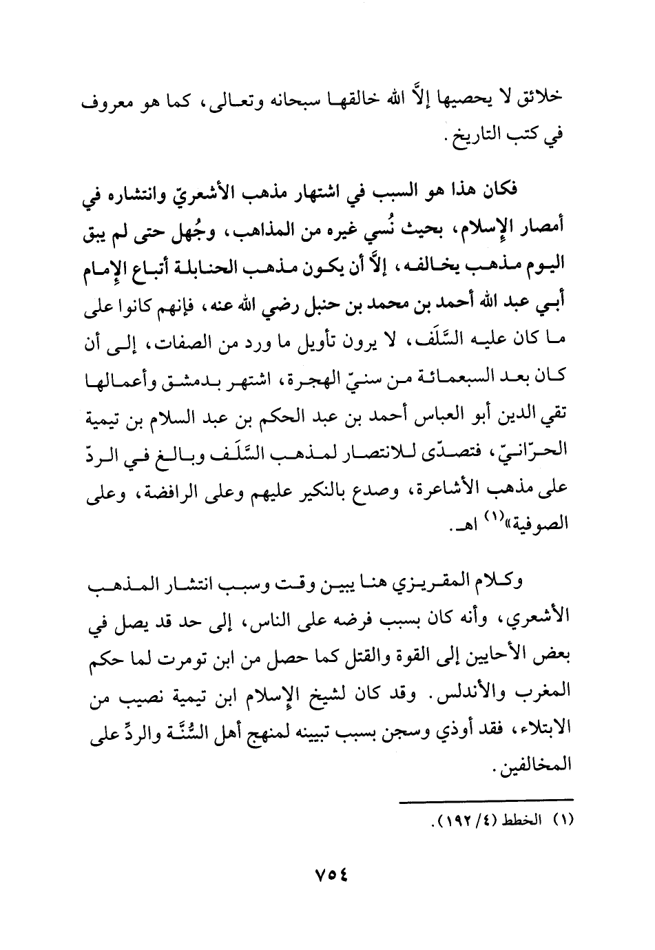 خلائق لا يحصيها إلاّ الله خالقها سبحانه وتعالى، كما هو معروف في كتب التاريخ، فكان هذا هو السبب في اشتهار مذهب الأشعريّ وانتشاره في أمصار الإسلام، بحيث نُسي غيره من المذاهب، وجُهل حتى لم يبق اليوم مذهب يخالفه، إلاّ أن يكون مذهب الحنابلة أتباع الإمام أبي عبد الله أحمد بن محمد بن حنبل رضي الله عنه، فإنهم كانوا على ماكان عليه السلف، لايرون تأويل ماورد من الصفات، إلى أن كان بعد السبعمائة من سني الهجرة، اشتهر بدمشق وأعمالها تقي الدين أبو العباس أحمد بن عبد الحكم بن عبد السلام بن تيمية الحرّانيّ، فتصدّى للانتصار لمذهب السلف وبالغ في الردّ على مذهب الأشاعرة، وصدع بالنكير عليهم