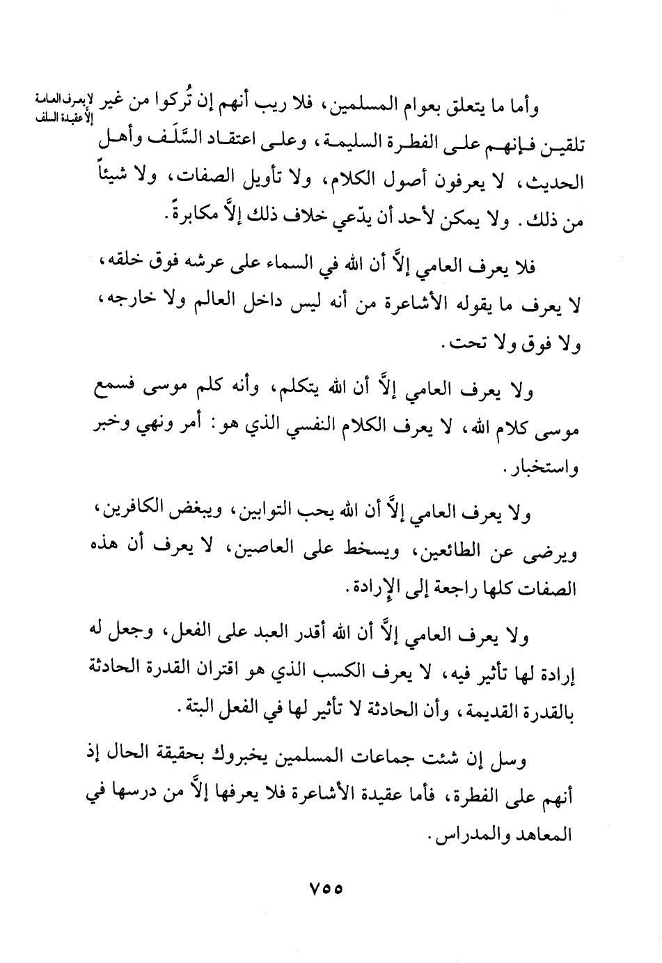 وأما ما يتعلق بعوام المسلمين، فلا ريب أنهم إن تُركوا من غير تلقين فإنهم على الفطرة السليمة، وعلى اعتقاد السلف وأهل الحديث، لا يعرفون أصول الكلام، ولا تأويل الصفات، ولا شيئاً من ذلك. ولا يمكن لأحد أن يدّعي خلاف ذلك إلا مكابرةً.