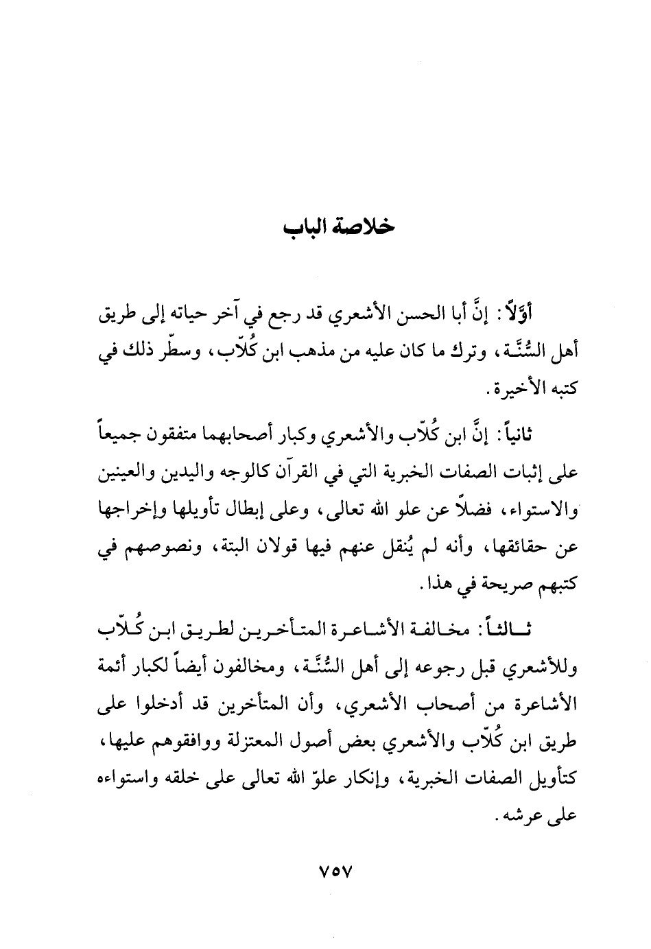 أولاً: أن أبا الحسن الأشعري قد رجع في آخر حياته إلى طريق أهل السنة، وترك ما كان عليه من مذهب ابن كلاب، وسطّر ذلك في كتبه الأخيرة.