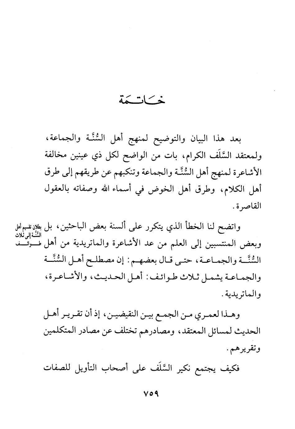 واتضح لنا الخطأ الذي يتكرر على ألسنة بعض الباحثين، بل وبعض المنتسبين إلى العلم من عد الأشاعرة والماتريدية من أهل السنة والجماعة، حتى قال بعضهم أن مصطلح أهل السنة والجماعة يشمل ثلاثة طوائف: أهل الحديث، والأشاعرة، والماتريدية.